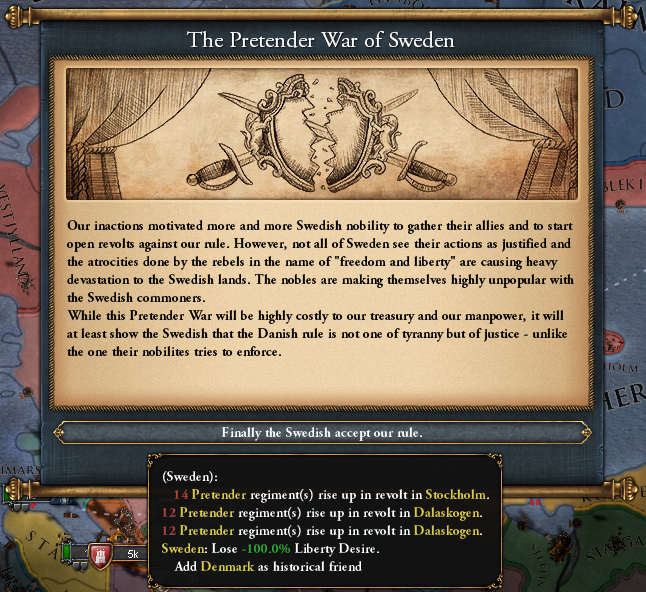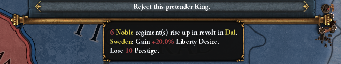 선택지 2번: 거부 - 귀족 반군 발생, 스웨덴 독립 열망 +20%, 덴마크 위신-10