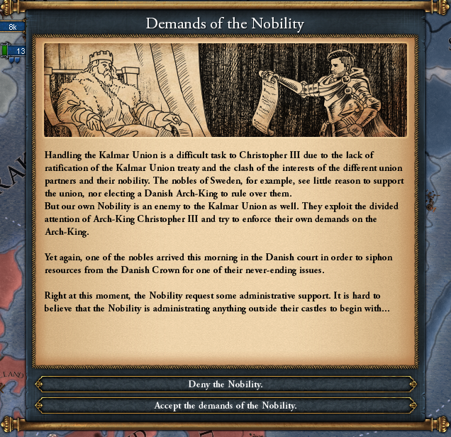 한편 스웨덴과 노르웨이의 귀족들은 다루는 것도 고통스럽지만, 국내의 귀족들을 잊어서는 안됩니다. 역사적으로, 덴마크 귀족들은 칼마르 연방을 지지하지 않았으며 덴마크 왕의 주의가 분산된 것을 이용하려 시도했습니다. 이러한 상황은 매 4년 마다 발생하는 이벤트의 형태로 구현되었습니다: