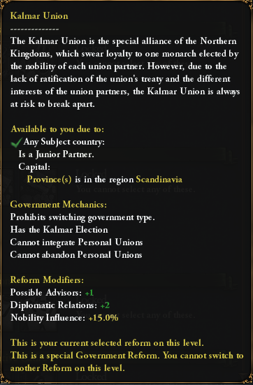 정부 기능: 정부개혁 종류 변경 불가, 칼마르 선거 보유, 동군연합 통합 불가, 동군연합 포기 불가