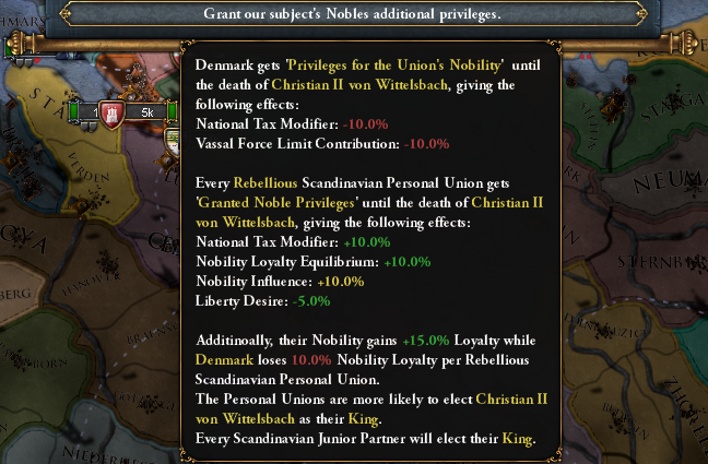 선택지 2번: 통치자 사망 전까지: 조세 수입-10%, 속국 병력 한계 기여도-10%. 모든 반항적인 스칸디나비아 동군연합 속국들은 현재 통치자 사망 전까지: 조세 수입+10%, 귀족 충성도 평형치+10%, 귀족 영향력+10%, 독립 열망-5% 획득. 추가로, 덴마크가 반항적인 동군연합 속국으로 인해 귀족 충성도를 10%씩 잃을 때마다 속국들의 귀족 계층은 충성도 15% 획득. 동군연합들은 해당 통치자를 왕으로 즉위시킬 가능성이 높습니다. 모든 스칸디나비아 동군연합 속국들이 왕을 선출합니다.