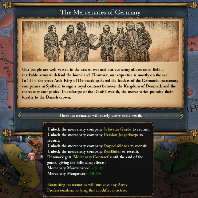 작지만 중요한 가지 중 하나로 제가 자세히 알려드리고 싶은 것은 용병에 관한 것입니다. 여러분 중 일부가 아시다싶이, 이 시기에 덴마크는 강력한 군대를 보유한 것으로 잘 알려져 있지는 않았습니다. 덴마크 병사들 대신, 덴마크의 왕들은 명령을 이행하기 위해 독일 용병들에 크게 의존했습니다. "독일 용병" 임무는 이것을 강조합니다. 독일 용병대의 본거지를 소유한 여러 국가들과 관계를 개선해 이 임무를 완료하면 다음 이벤트를 얻습니다: