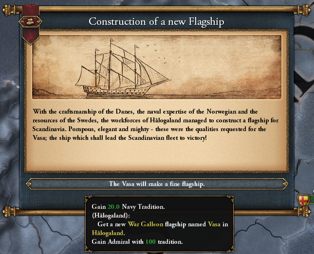 가장 우측에 있는 마지막 가지의 임무들은 스웨덴산 스칸디나비아의 자랑이 될 기함 건조를 다룹니다. 물론 이 임무들은 바사 호와 관련된 것입니다.