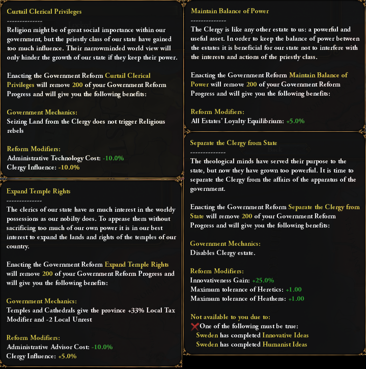 -절대주의와 혁명 갈래: 스칸디나비아는 스웨덴, 덴마크, 노르웨이가 아닐 경우 행정 레벨 20에 형성 가능 국가. 후반 게임을 위한 보상으로 최대 절대주의+20, 외교관+1, 불만도-3