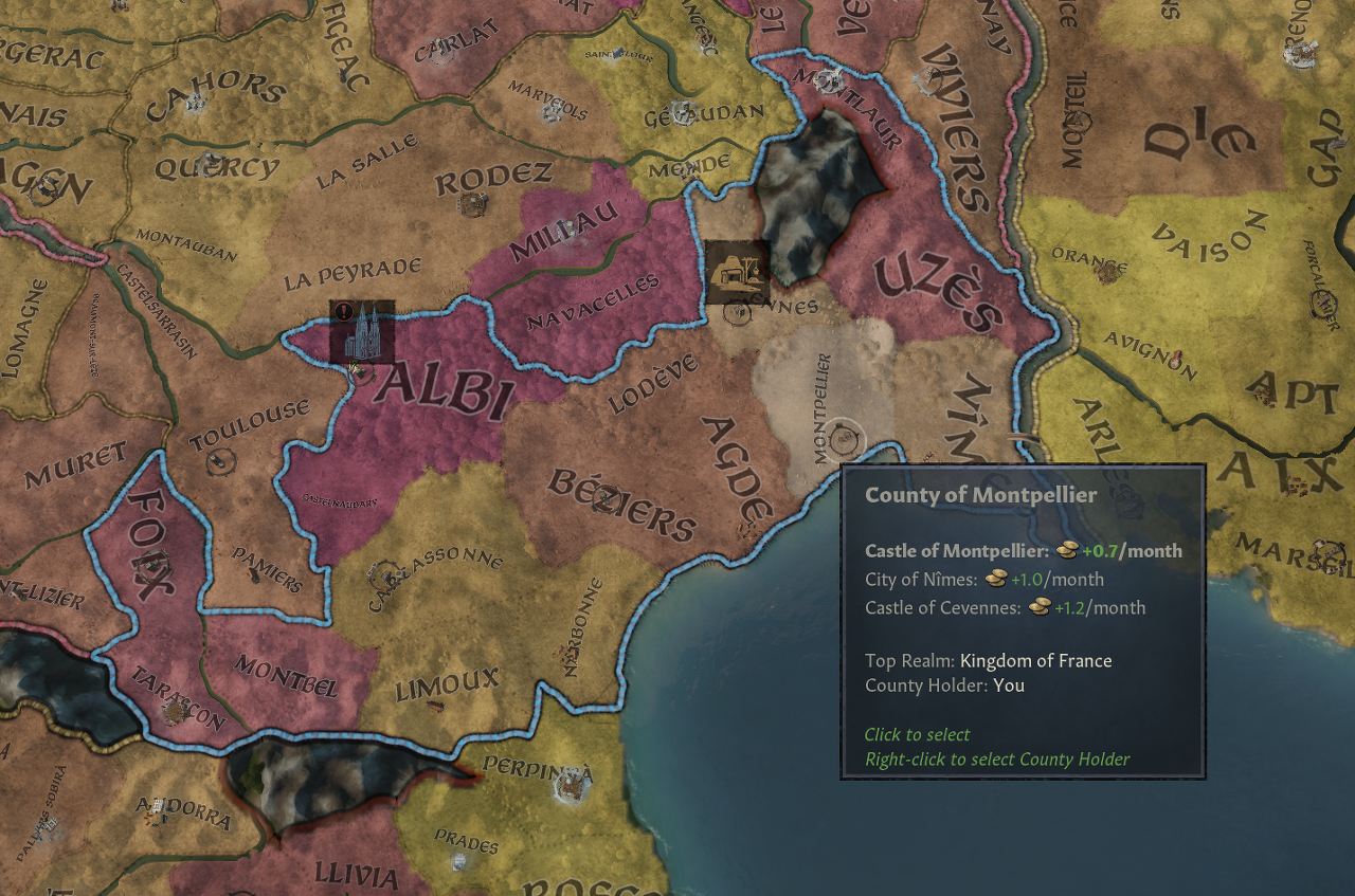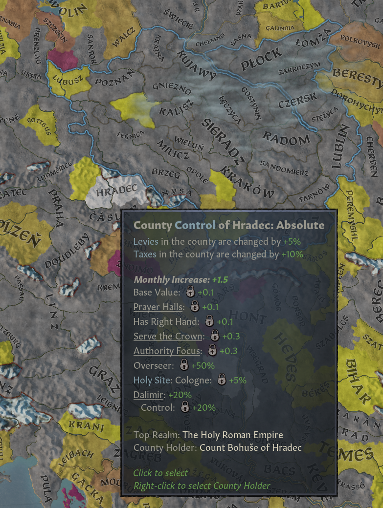 -색상은 백작령에 기준해서 칠해지며, 백작령에 포함된 도시, 주교령 등의 수입을 모두 포함