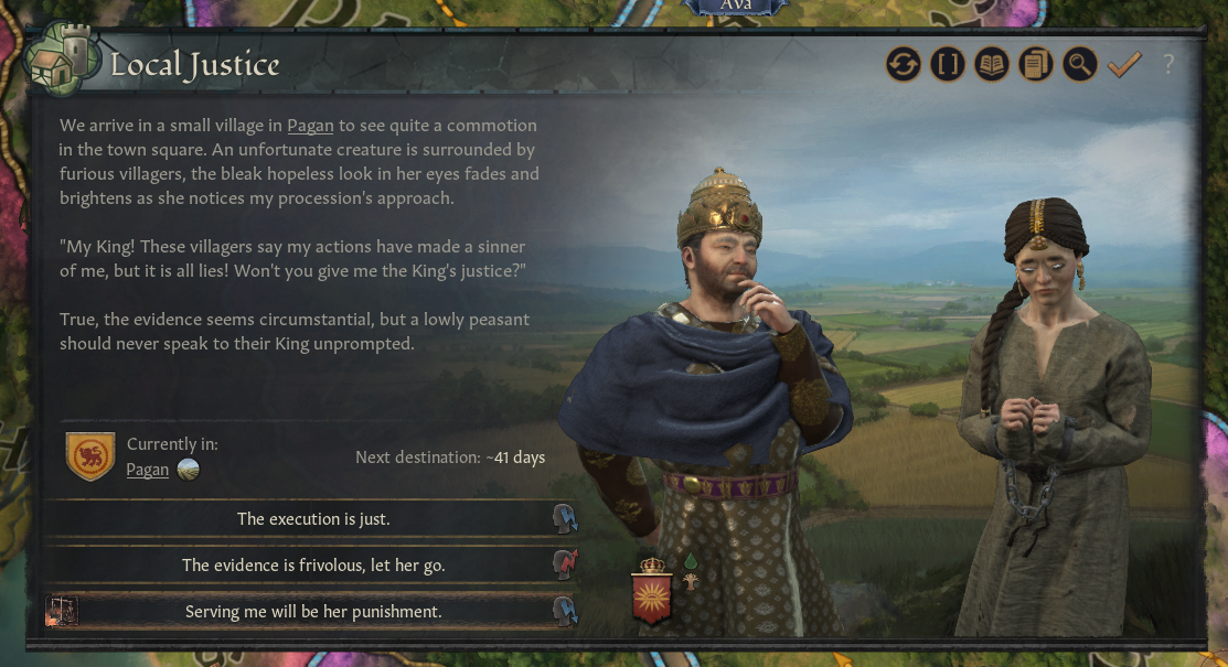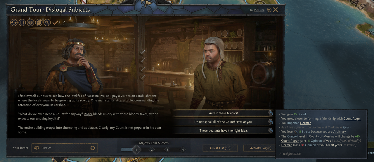 -정의: 지역 재판 심판, 농민 지도자와의 면담, 도적 제거 등을 통해 정의를 보여줌; 적절한 특성에 따라 스트레스 감소, 죄수 획득, 장악력 증가