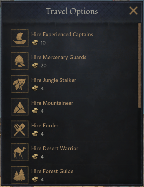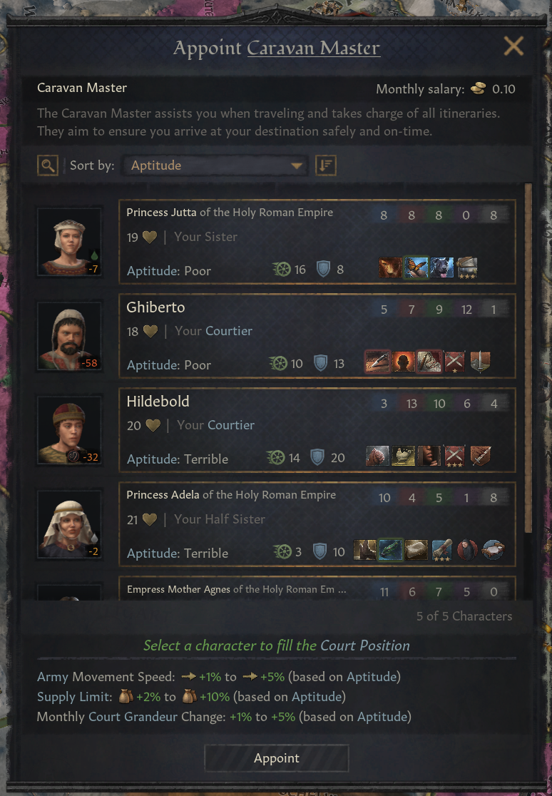 -궁정 의사나, 경호원 같은 인물들은 궁정 직위에 고용했다면 자동으로 이동 수행단에 참여함