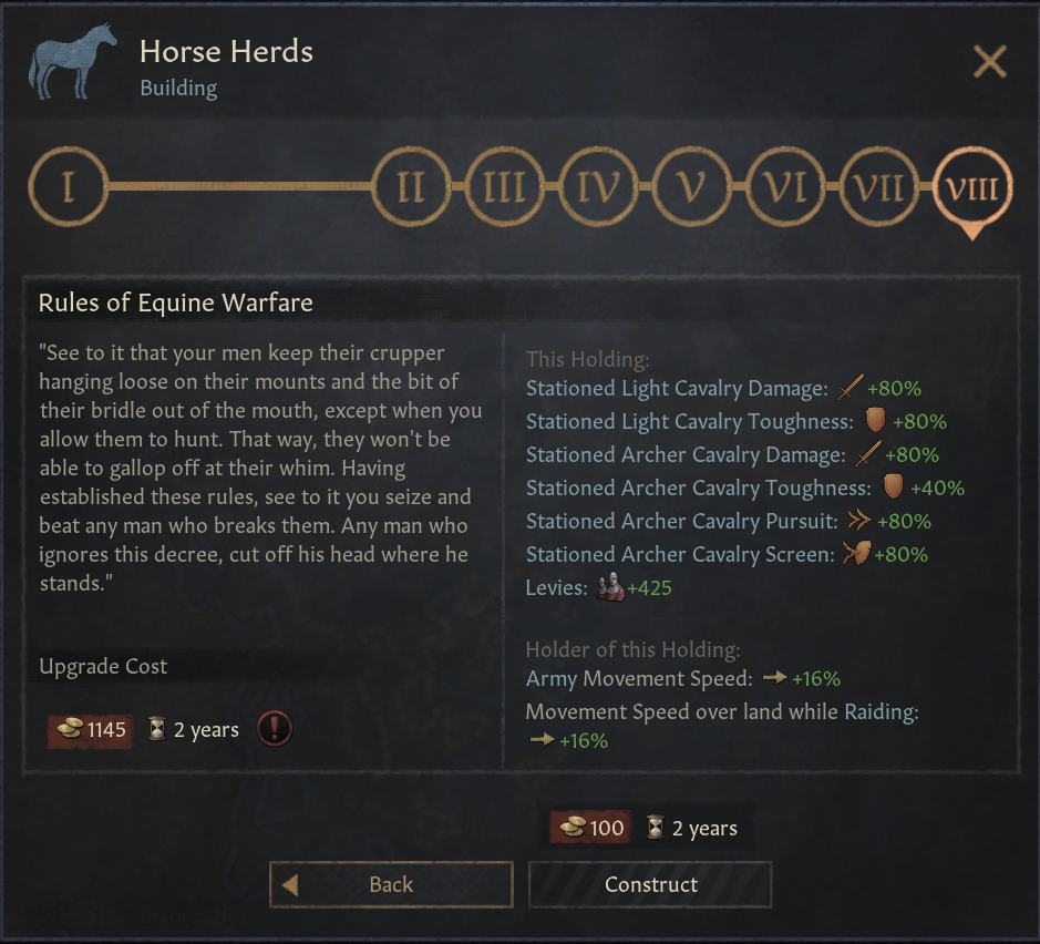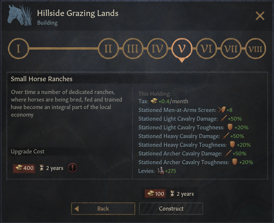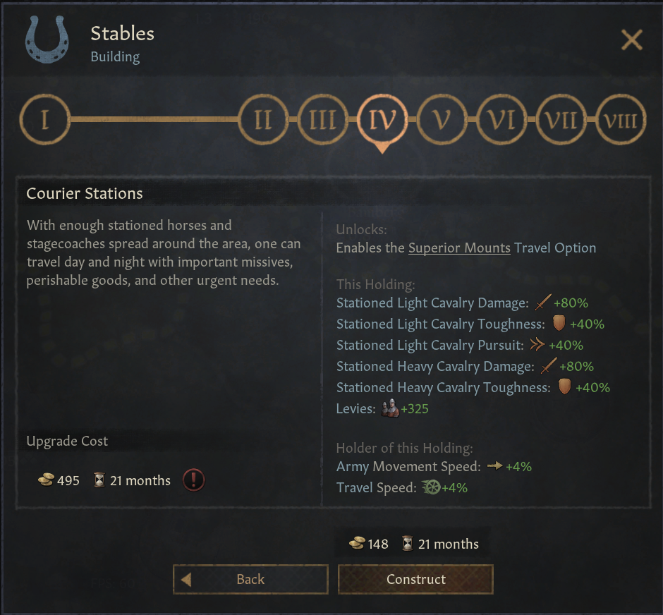 -마구간: 사냥터 대신 경기병, 중기병 보너스 제공. 군대 이동속도 증가. 이동 시스템 속도 증가. ‘우월한 탈것’ 이동 선택지 제공