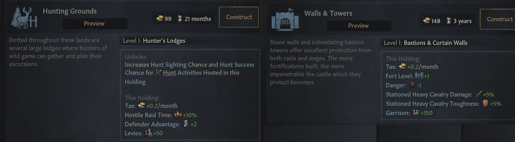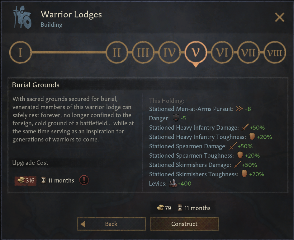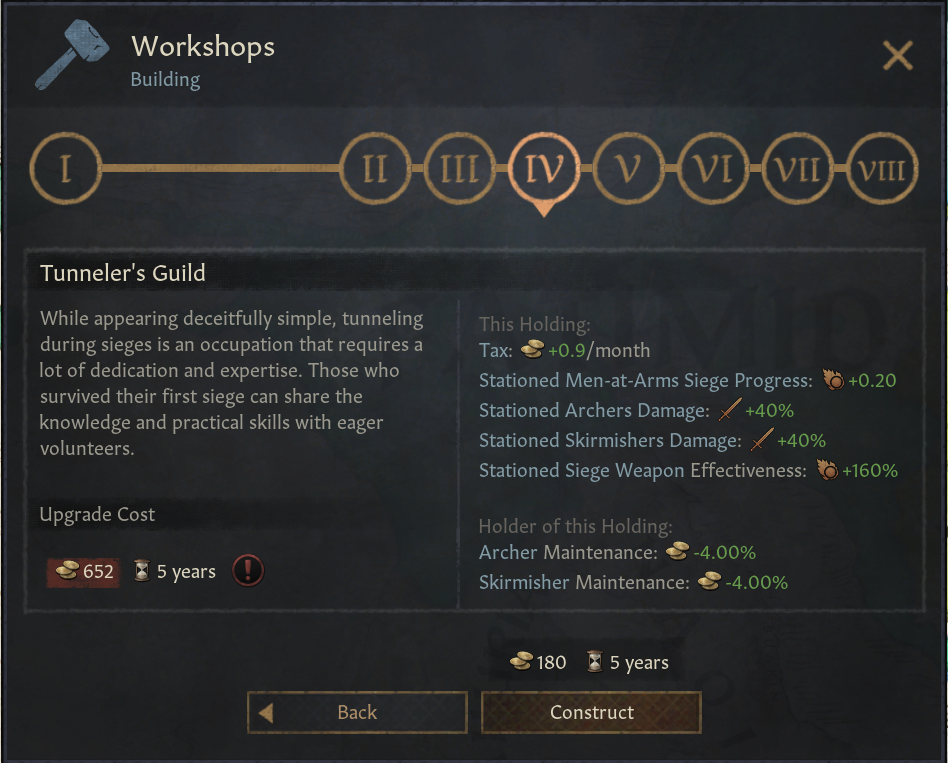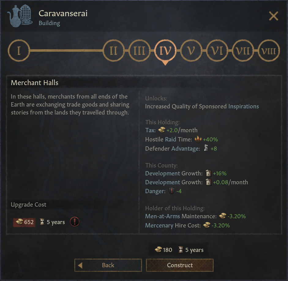 -대상 숙소: 개발도 효과는 가장 낮으나, 흥미로운 효과 보유. 길드 혁신으로 해금. 용병 및 무장병 비용 감소. 유물 품질 및 방어력 보너스. 사막 및 건조지대 지형