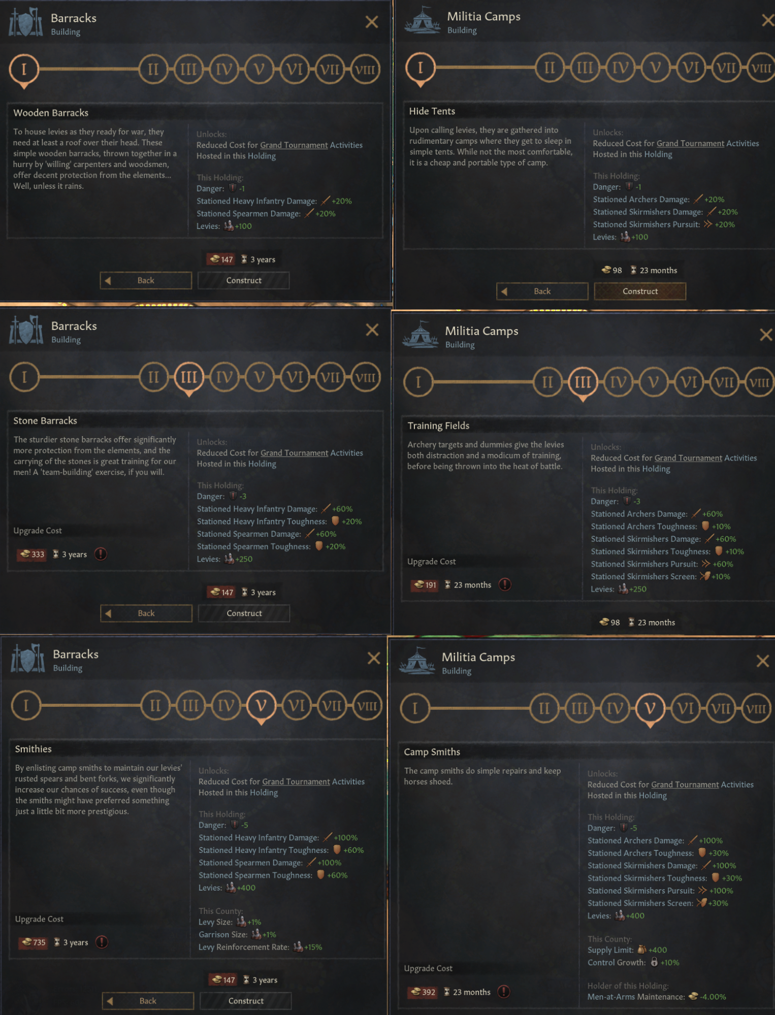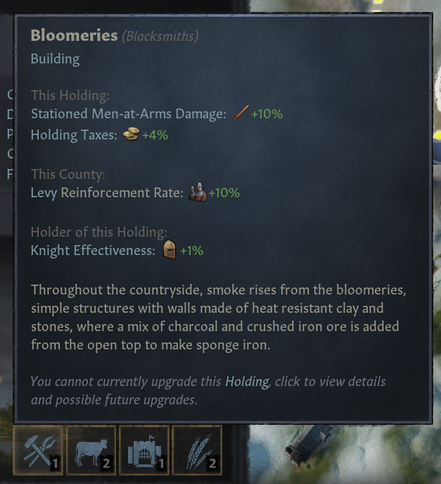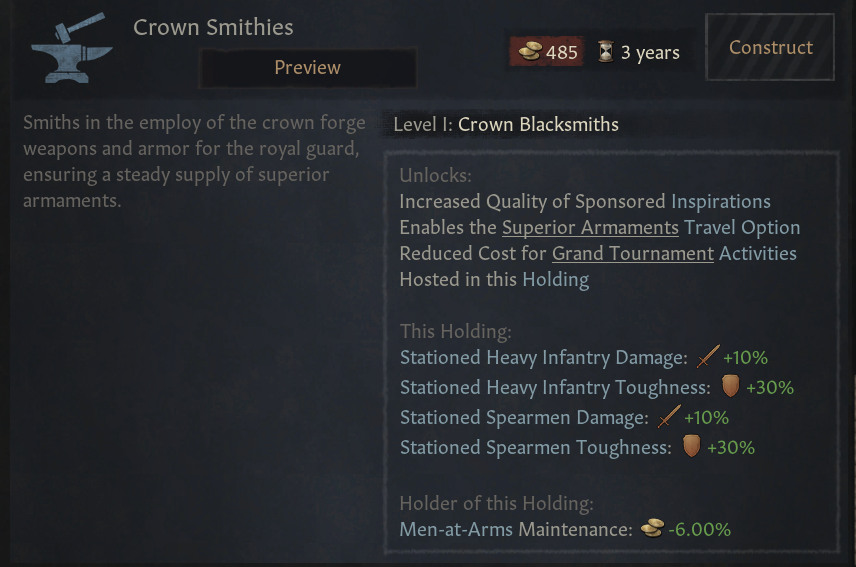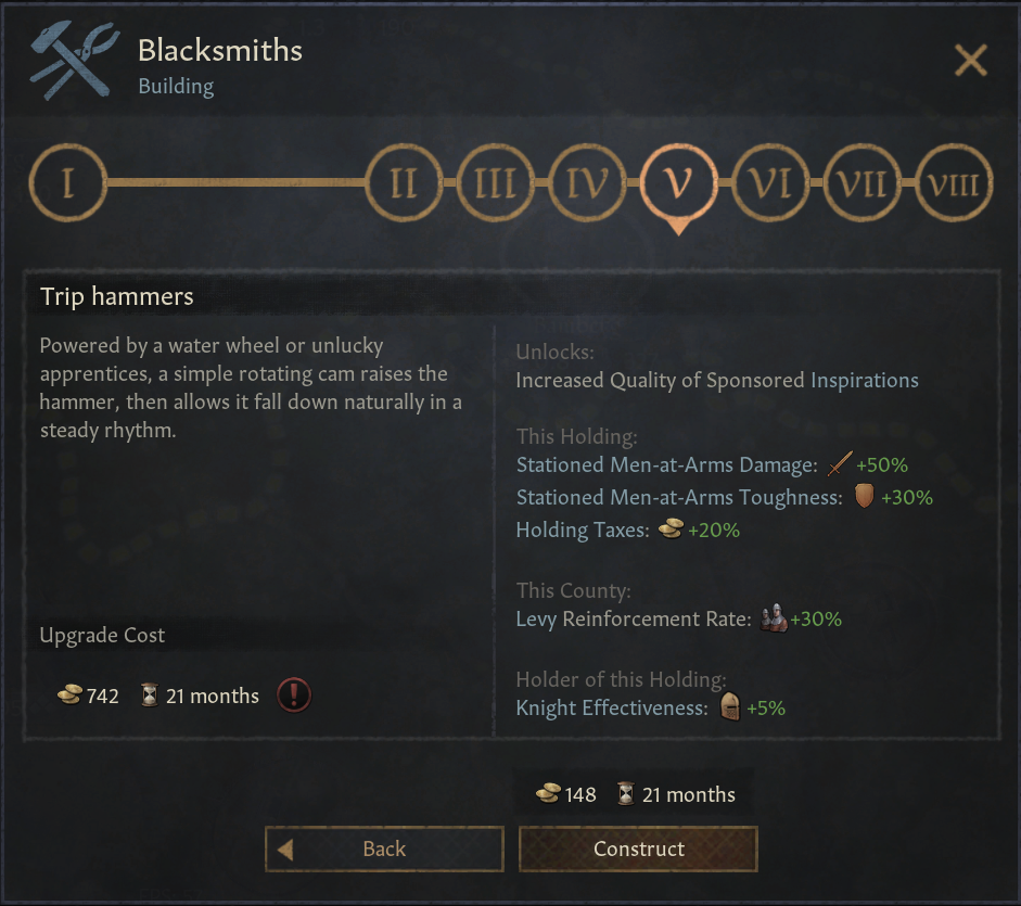 -대장간: 모든 무장병 보너스 제공. 영제 세금 %보너스. 징집병 충원율 증가. 5단계 시 유물 제작 품질 증가(이제 유물 제작 결단은 -20 품질의 일반 등급 유물만 제작하는데 이를 보완 가능)