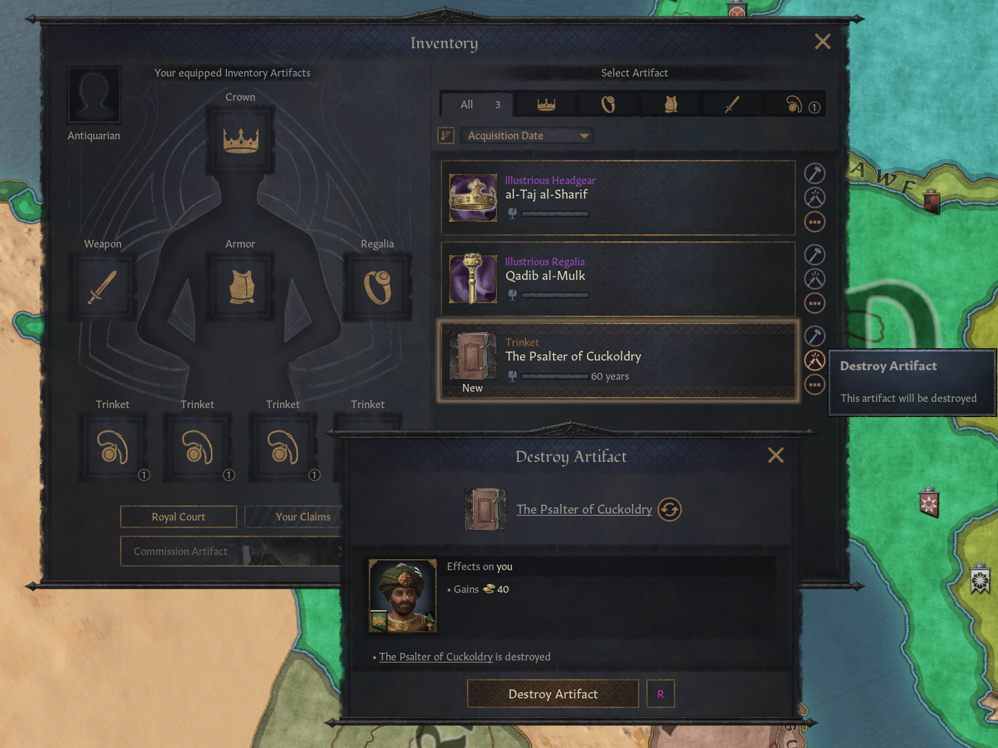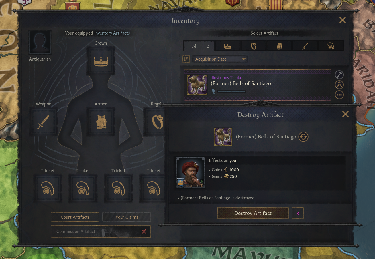 -모든 통치자는 1,2 등급 유물 파괴 가능. 파괴 시 유물 제작 비용의 반값 안되는 돈 획득