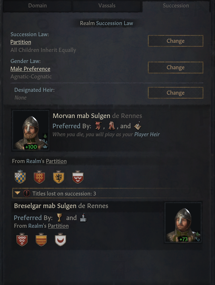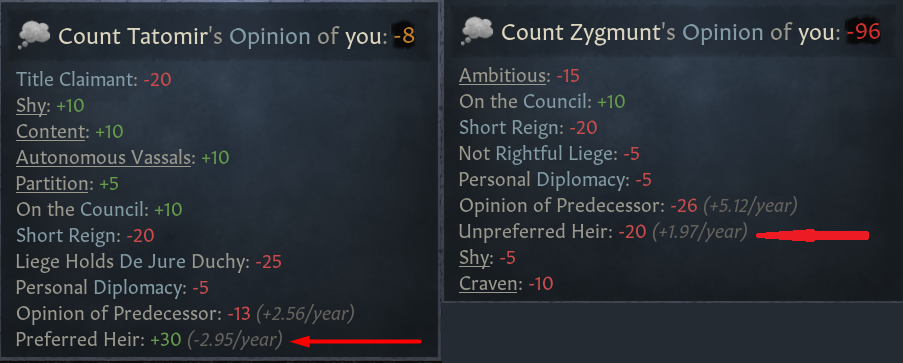-모든 태세는 선호하는 특정 후계자가 있으며, 해당 후계자가 즉위 시 관계도 증가함, 반대일 시 관계도 감소