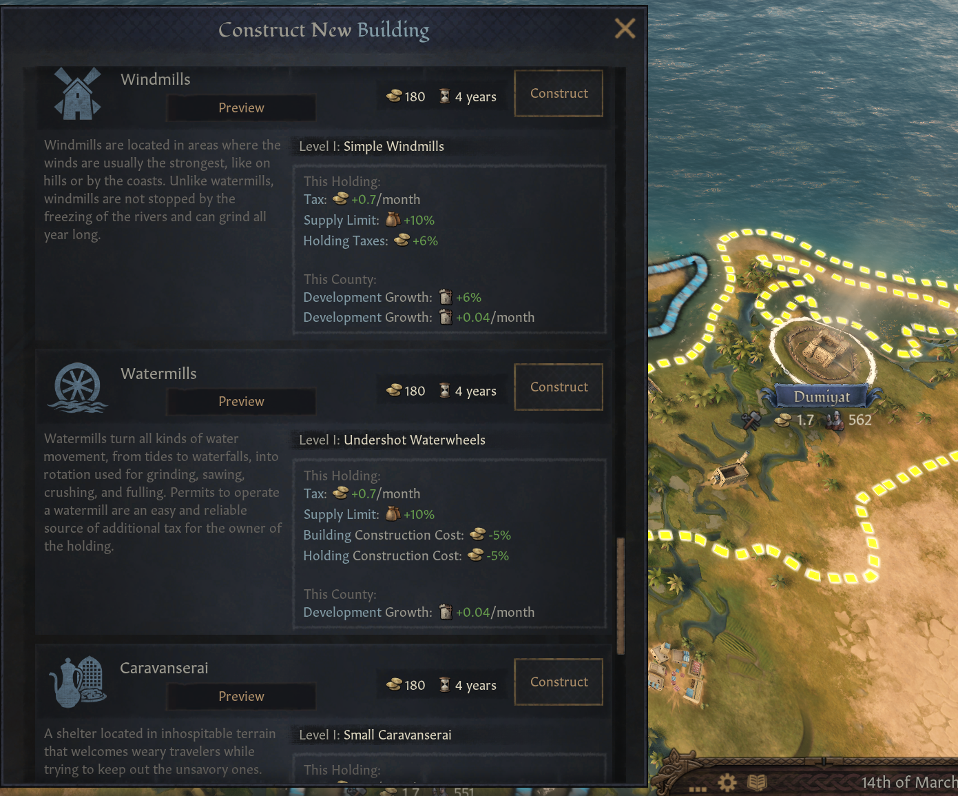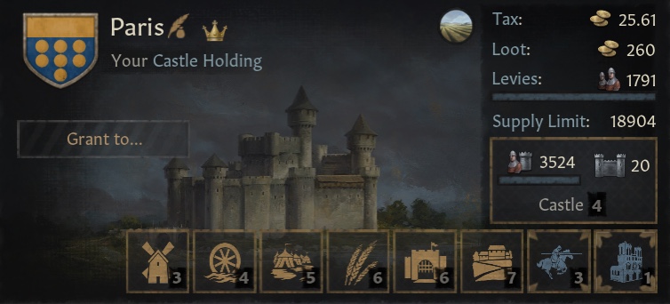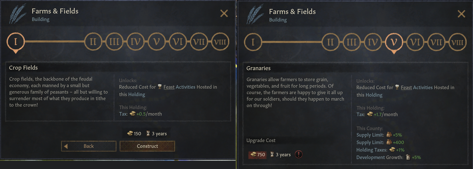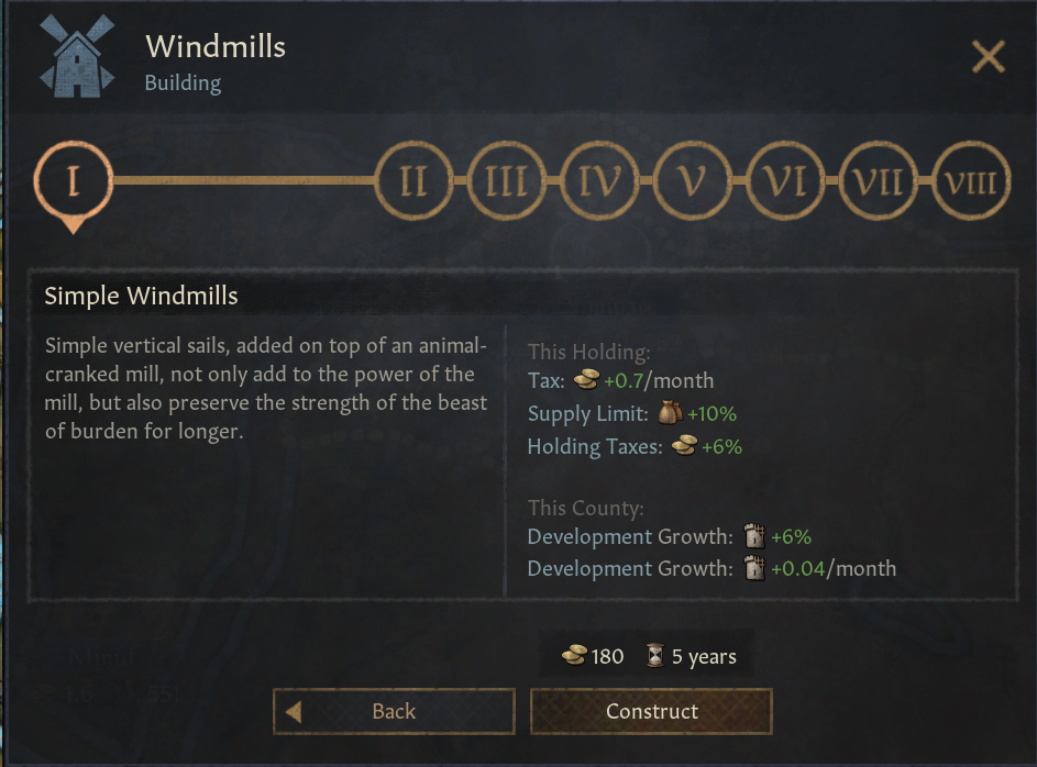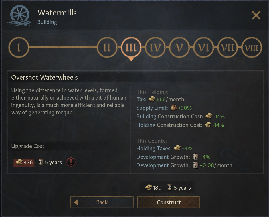 -물레방아: 풍차보다는 덜 강력하지만 가치있음. 풍차 혁신으로 해금. 언덕, 산악, 숲, 강가 지형. 해당 영지 건설 보너스. 백작령 전체 경제 보너스