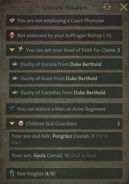 -좋아하는 주군 행동: 영지 건설 및 업그레이드, 자신을 가까운 가족의 후견인으로 임명, 국내 업무 자문회 능력 사용