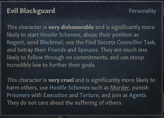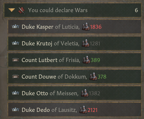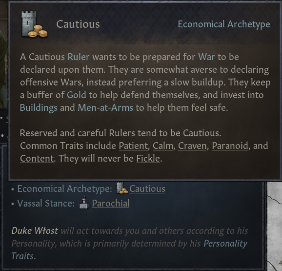 -싫어하는 주군 행동: 높은 왕권 보유, 사소하지 않은 전쟁 선포(본국 군사력의 80% 이상의 적)