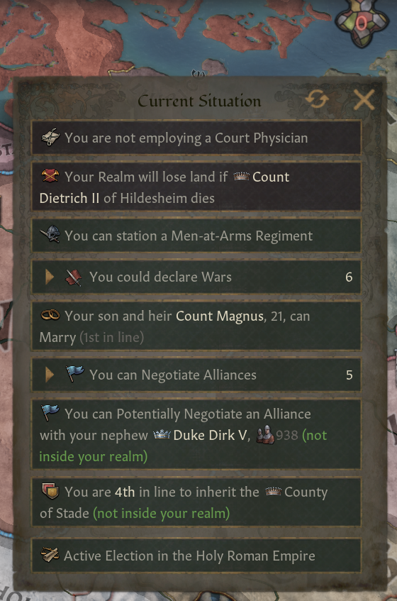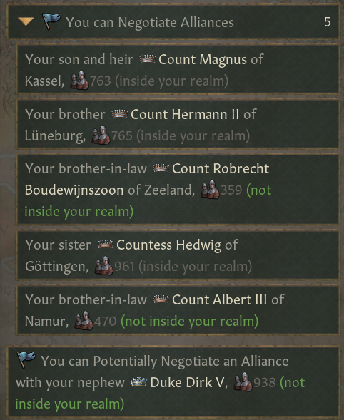 -예시) 지역적 태세의 모든 인물들: 영지 건설 및 업그레이드 시 관계도 증가, 사소하지 않은 전쟁 선포 시(본국 군사력의 80% 이상의 적) 관계도 감소