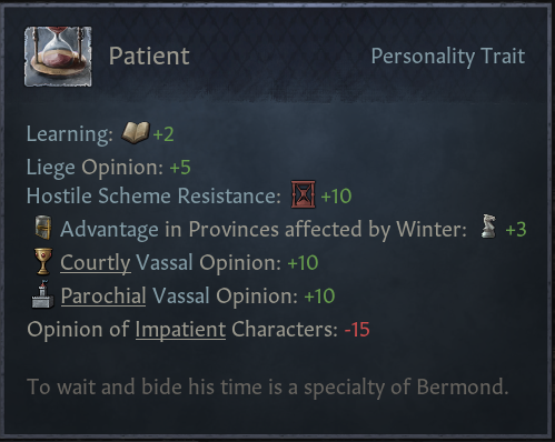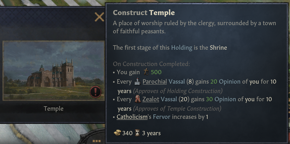 -좋아하는 주군 행동: 사원 건설 및 업그레이드, 언어 습득 모략 성공, 미덕 특성 보유, 순례 착수