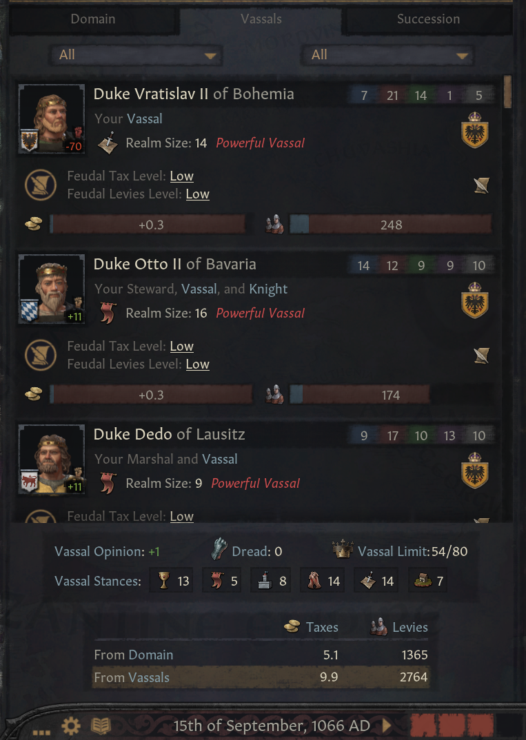 -자유와 낮은 세금 원함. 모든 남작급 봉신들은 이 태세 선택