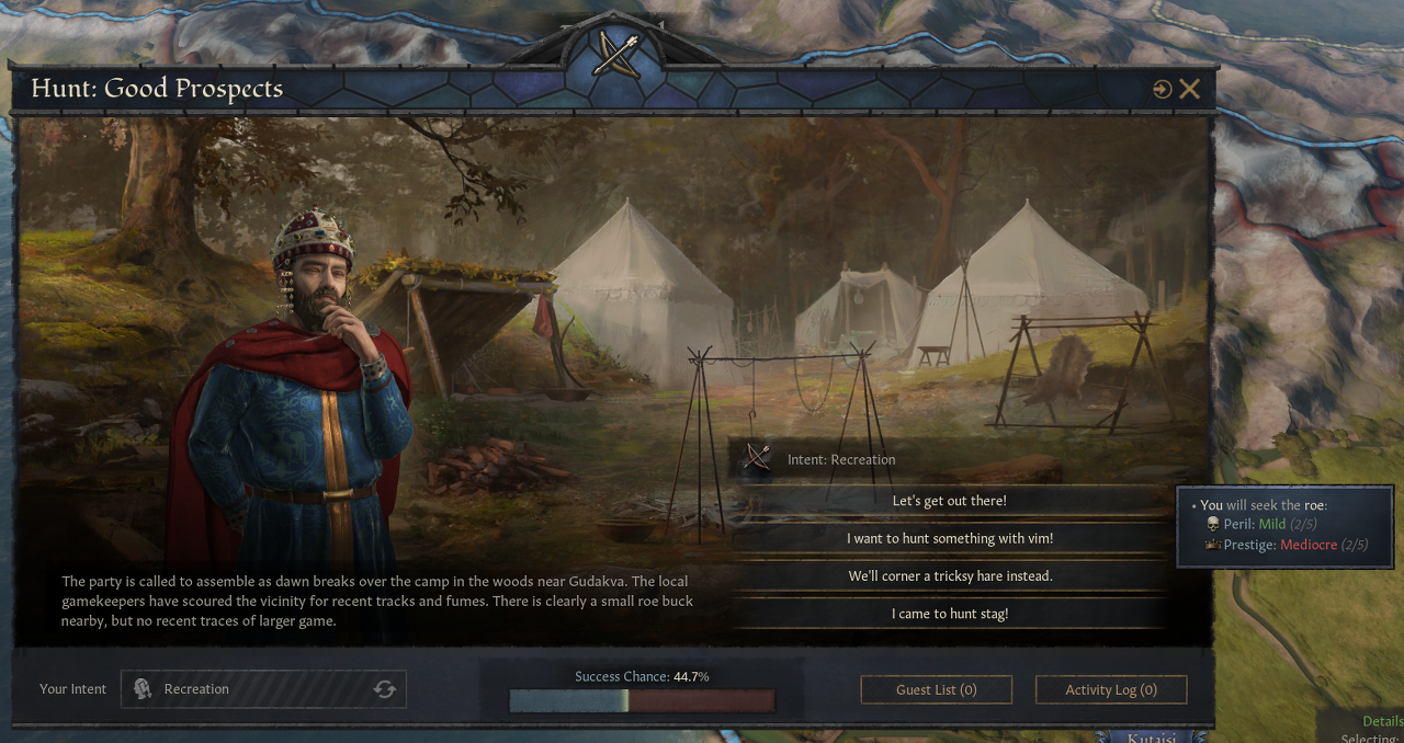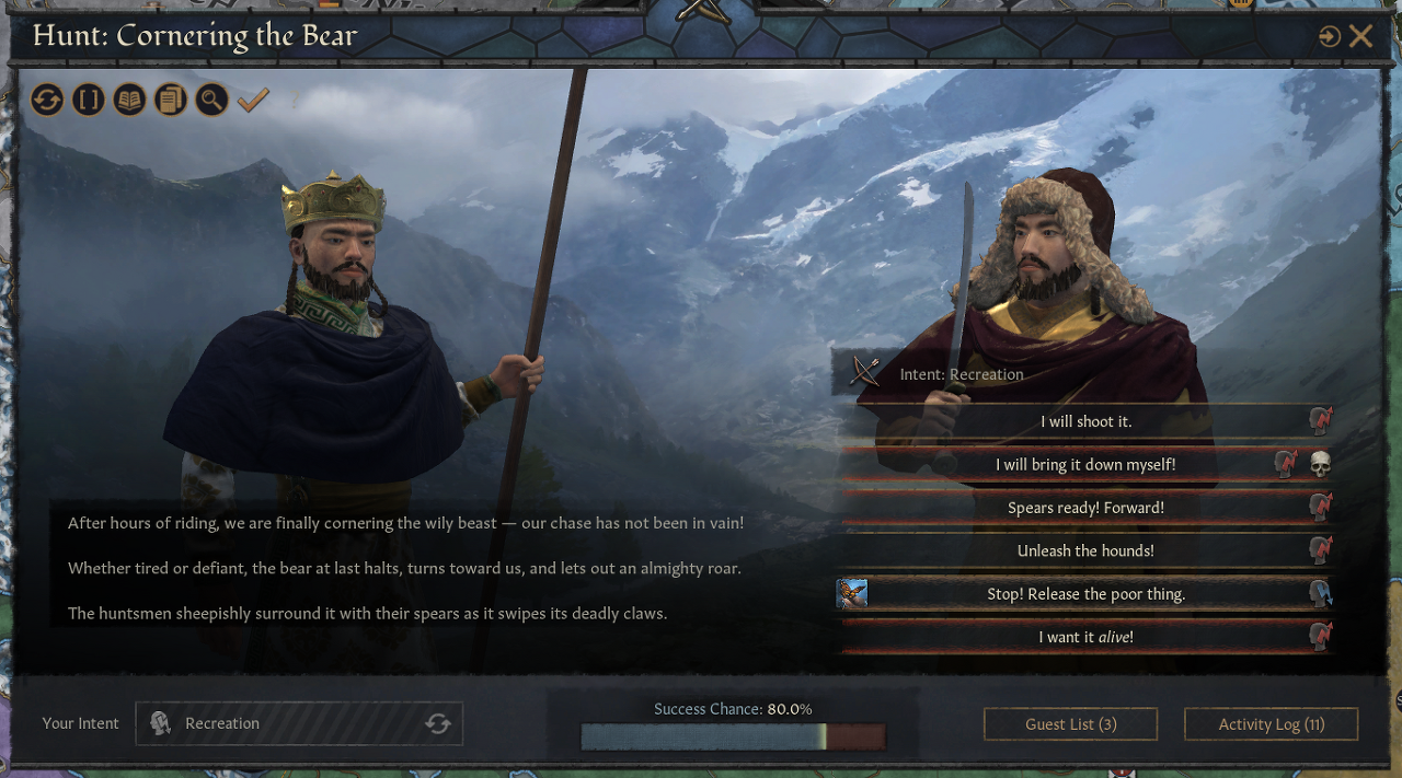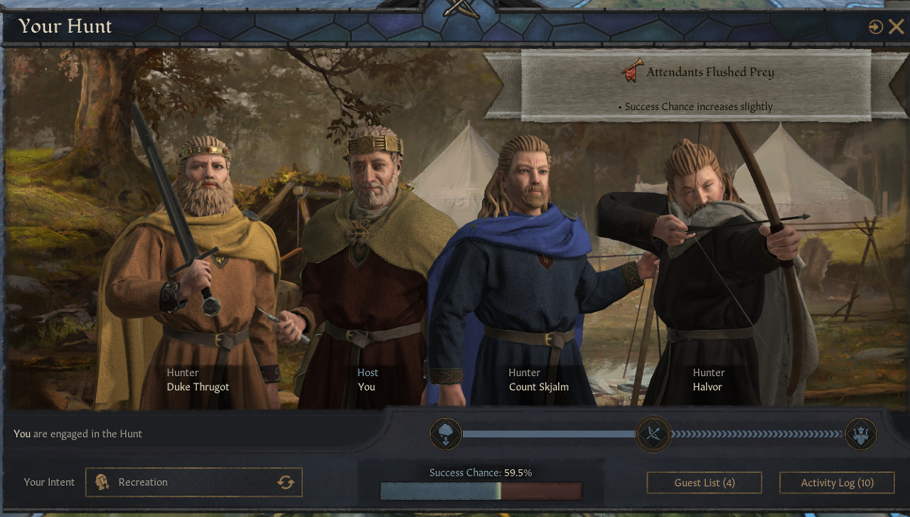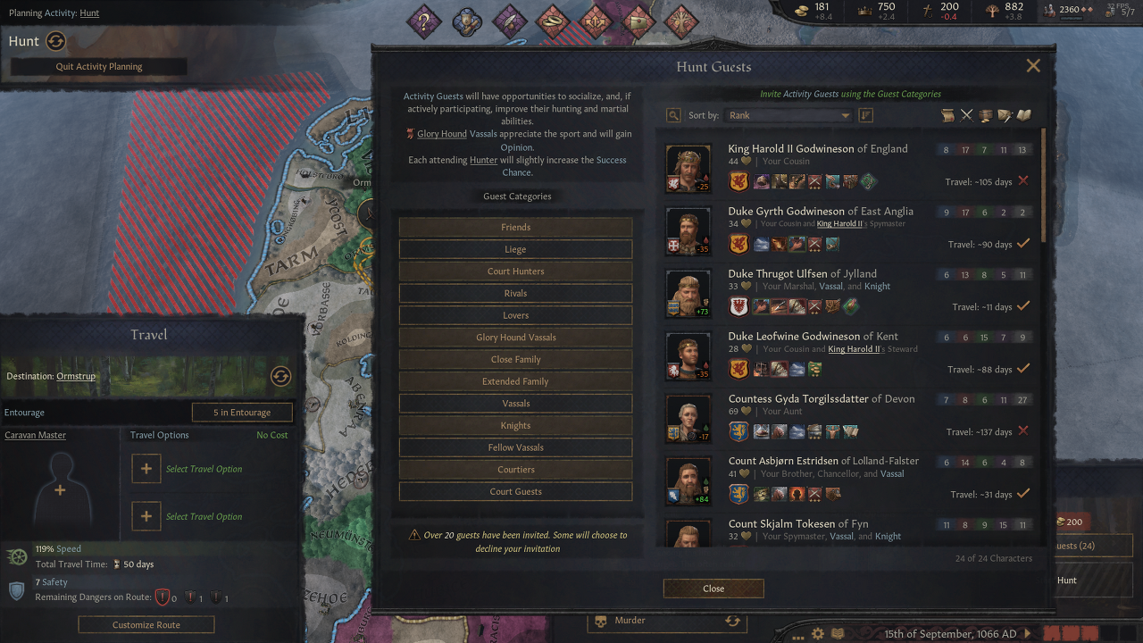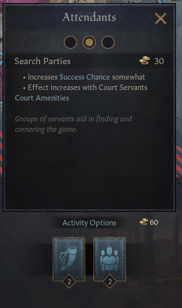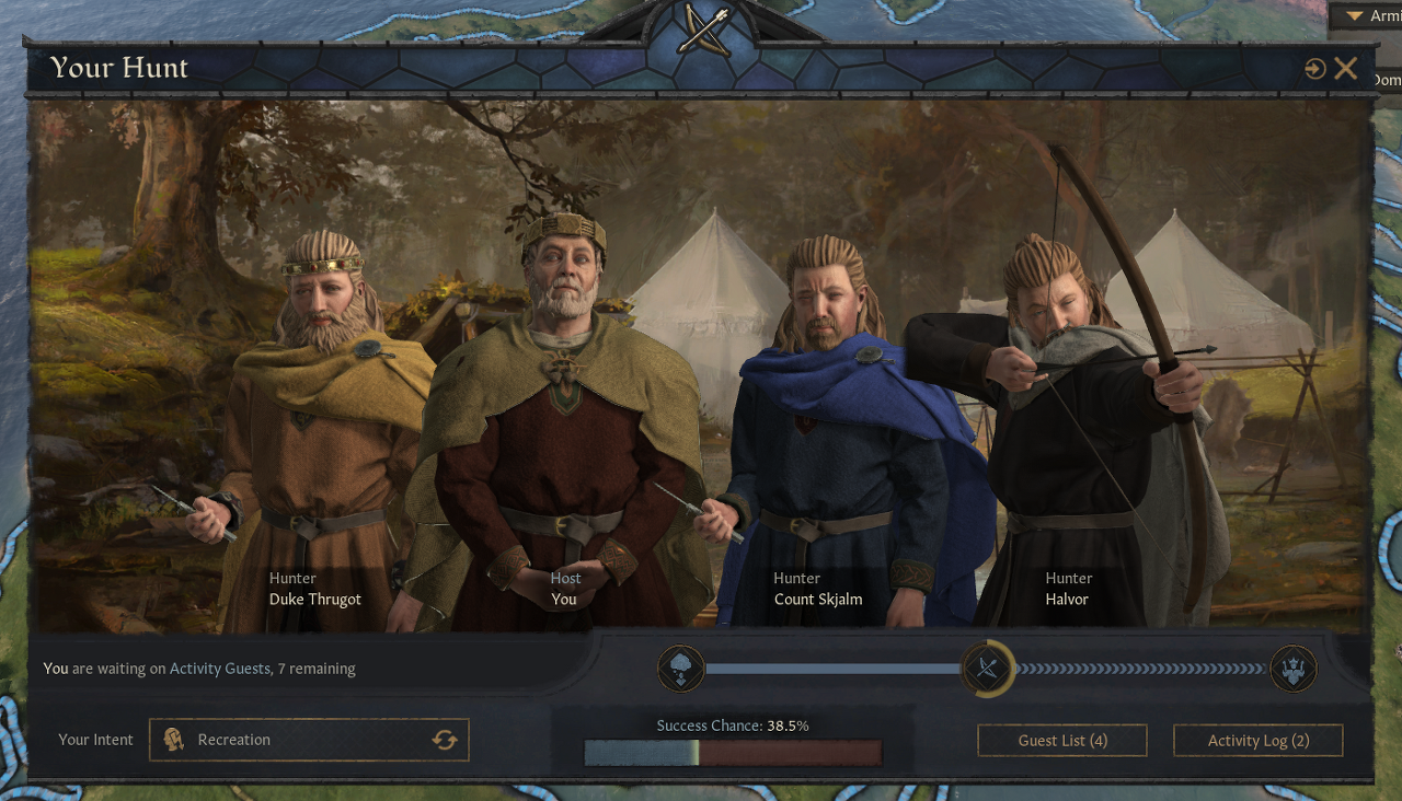 -활동마다 참여 인원 수도 정해져있음. 결혼식이나 토너먼트 같은 경우 사냥보다 참여 인원이 많음. 인원 한계를 넘어서 초청할 경우, 덜 중요한 인물들이 자동으로 걸러짐