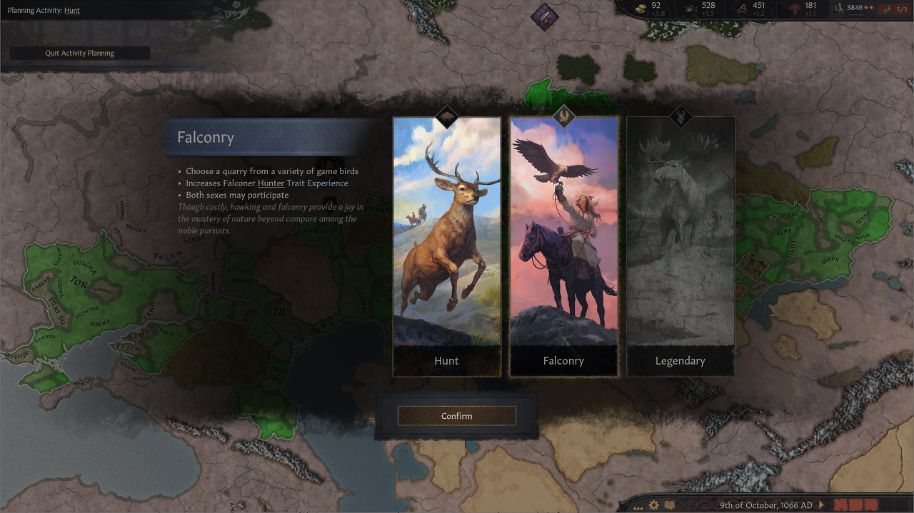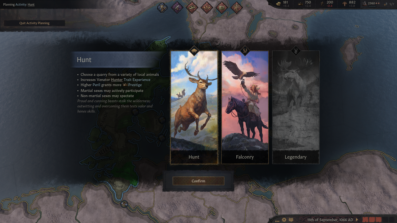 -사냥 활동 종류는 위에서 설명했는데, 그 중 전설 사냥은 인물이 사냥에 심취했을 때 그리고 신화적인 동물이 실제로 존재한다고 의심되는 장소에서만 가능(아래에 다룰 예정)
