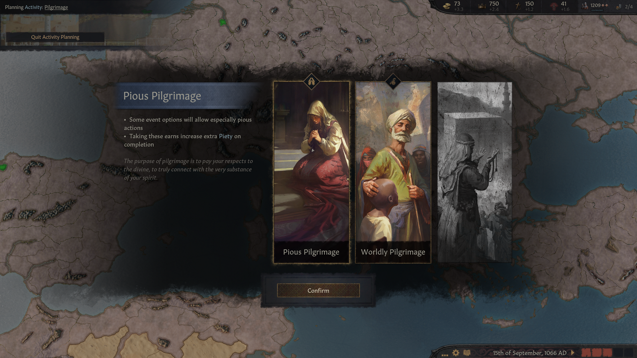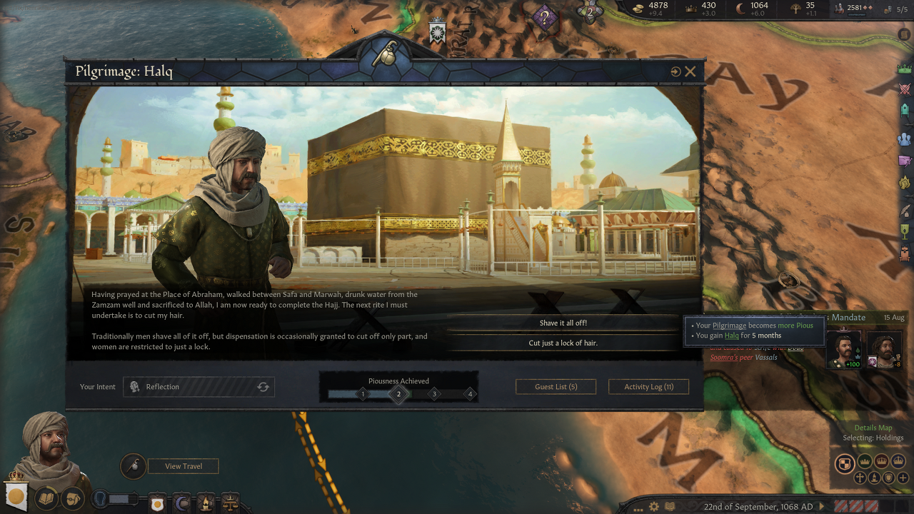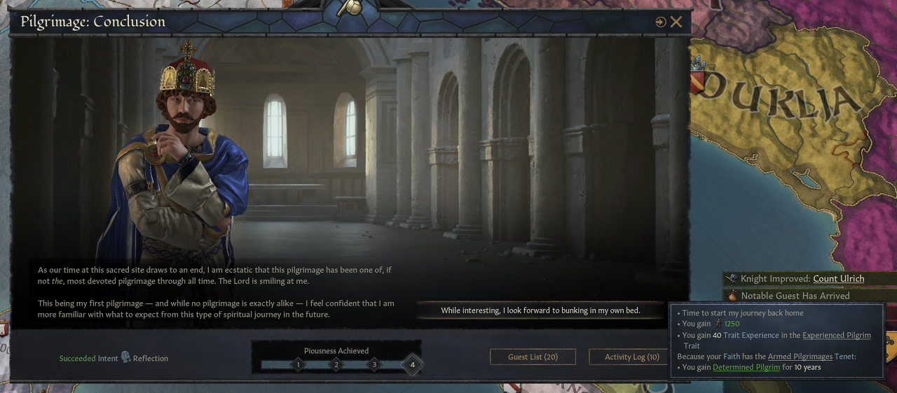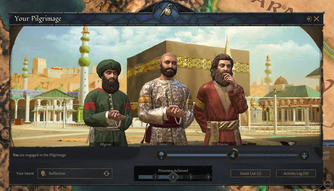 -하지: 이슬람 전용 순례. 메카 성지만 선택 가능. 이슬람 통치자는 하지 순례 이후에 다른 성지들 다른 순례 가능. 경건한 순례와 비슷하지만 성지에서 발생하는 이벤트들이 다름. 일반 순례보다 더 정해진 순서대로 진행됨. 하지 완료 시 하지 특성 획득