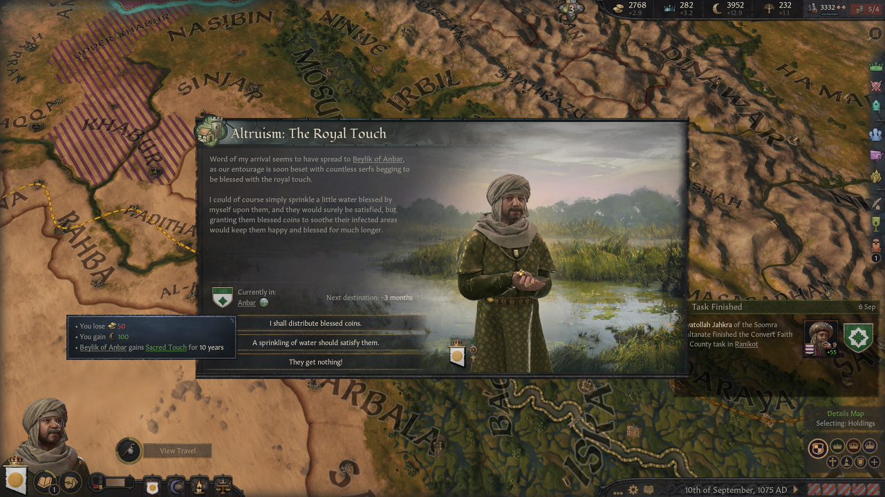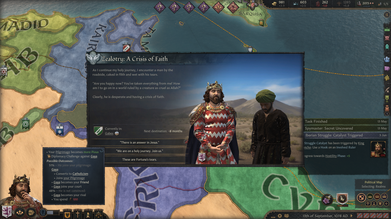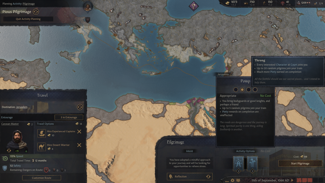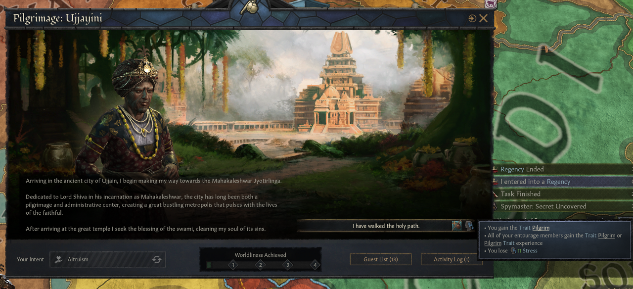 -하지: 이슬람 전용 순례. 메카 성지만 선택 가능. 이슬람 통치자는 하지 순례 이후에 다른 성지들 다른 순례 가능. 경건한 순례와 비슷하지만 성지에서 발생하는 이벤트들이 다름. 일반 순례보다 더 정해진 순서대로 진행됨. 하지 완료 시 하지 특성 획득