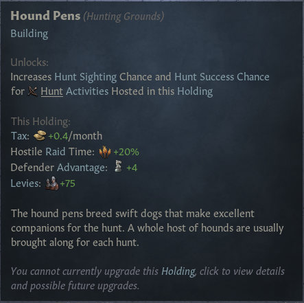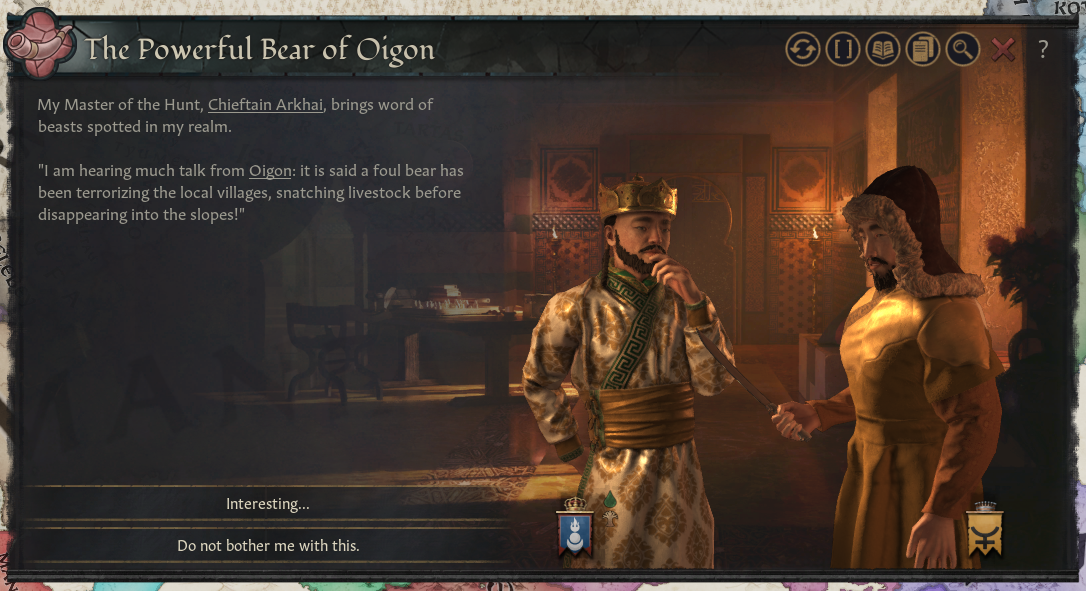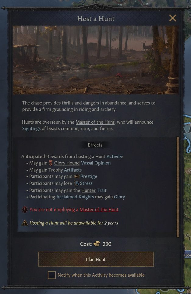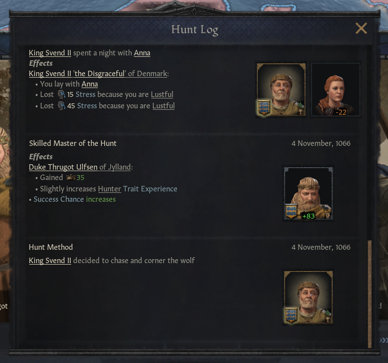-사냥터 관리관 고용했거나 궁정에 사냥꾼 있을 시 목격 이벤트 발생 가능. 그 빈도와 위치는 인생 경험과 사냥터 관리관 적성, 영지의 특정 건물에 영향받음