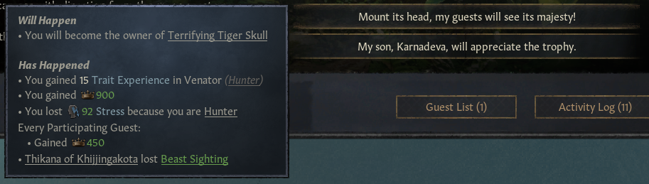 -각 활동들 선택 시, 세부 사항을 볼 수 있음: 당신과 당신의 손님들이 얻을 수 있는 결과, 사냥터 관리관 공석, 쿨다운 기간 등