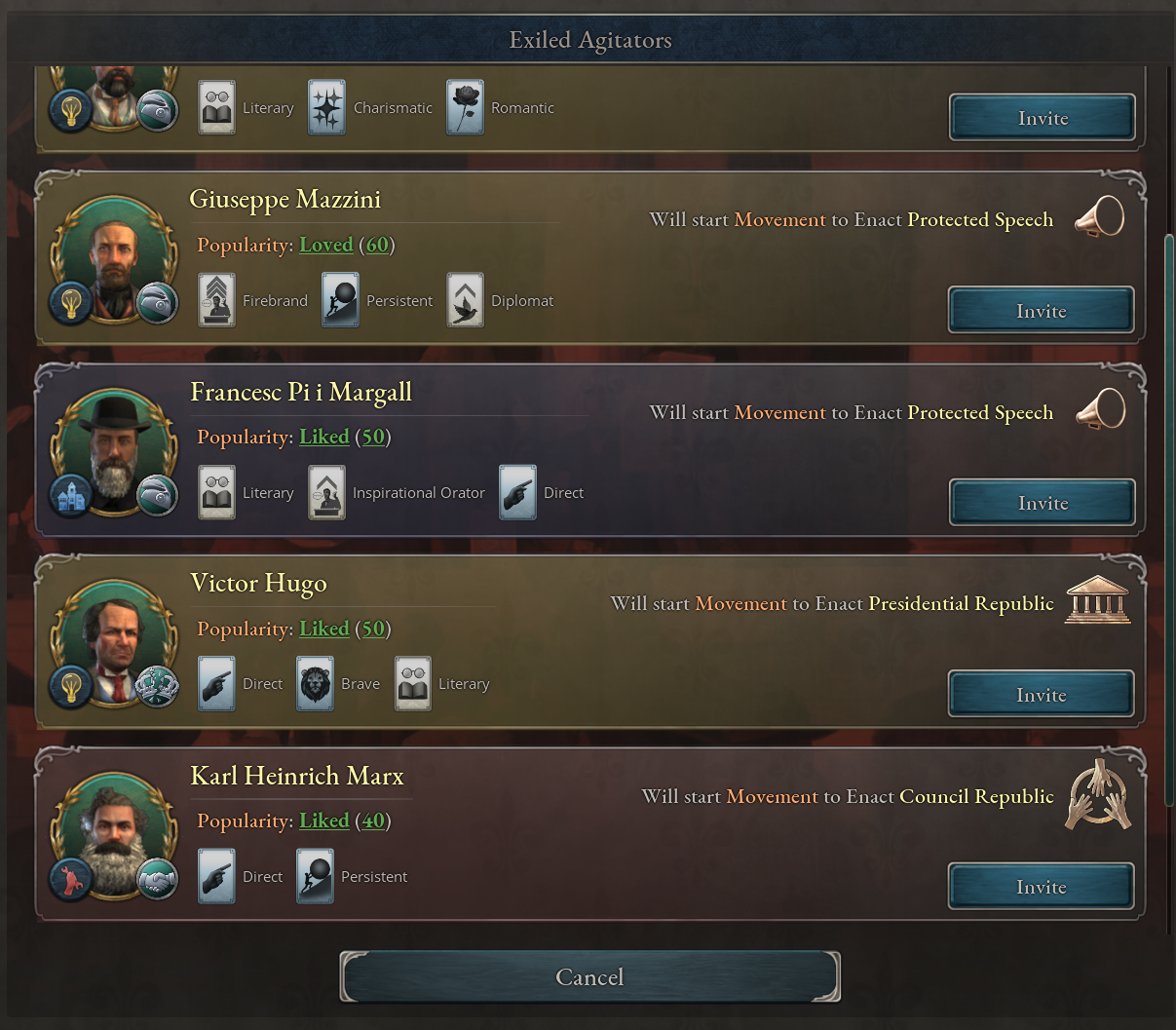 •운동가를 국외로 추방하여 정치적 망명을 보낼 수 있음. 또한 망명 중인 선동가들을 자국으로 초대하여 원하는 개혁을 이루는 데 활용할 수 있음