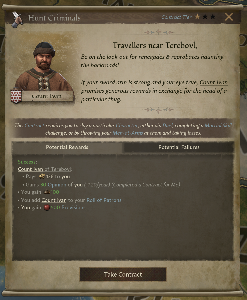 -계약 성공 시, 계약 종류에 따라 금/위신/신앙심/식료품(모험가 전용 자원) 등 다른 자원을 획득함