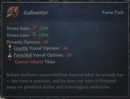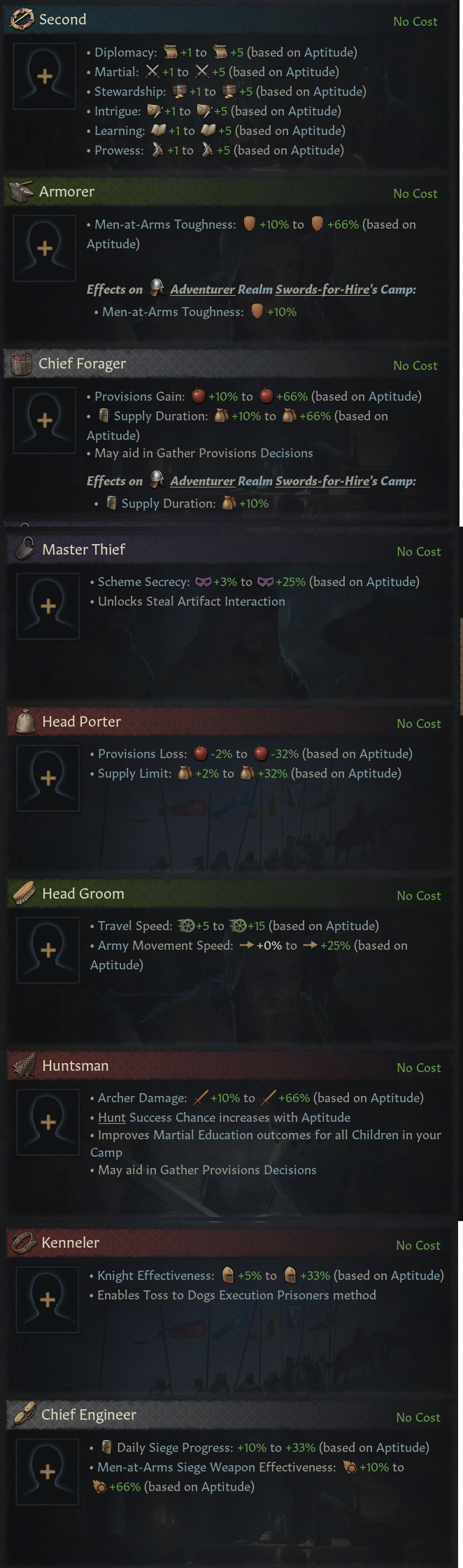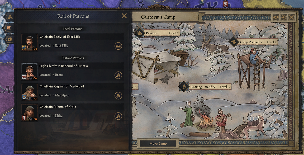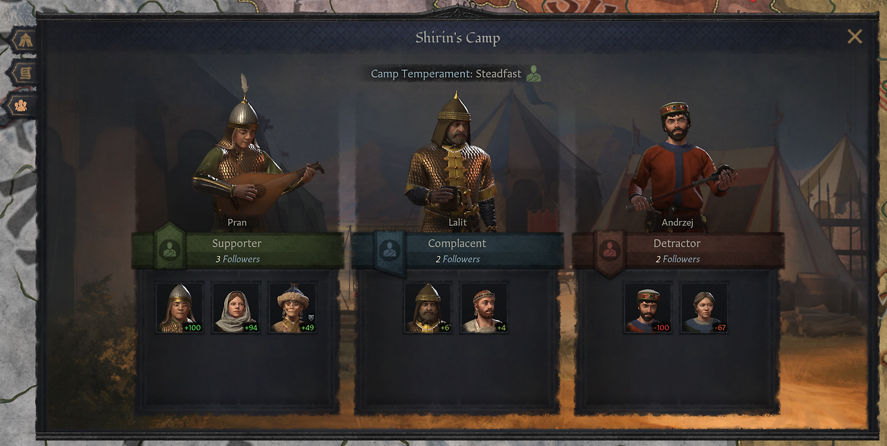 -야영지 기질: 부하(지주의 궁정신하)가 당신을 얼마나 좋아하냐에 따라 지지자/무관심/비방자로 나뉨