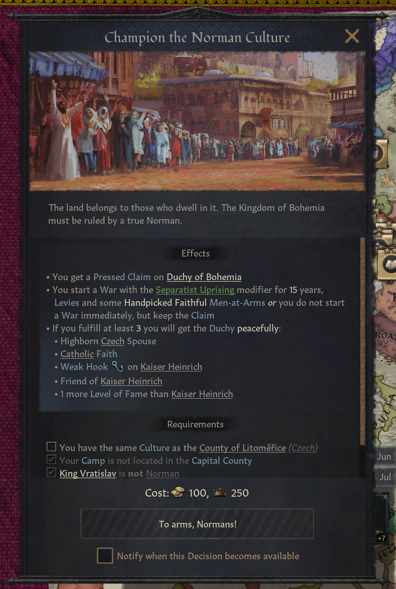 -노르만 문화: (DLC 전용) 대담한 방계 전통 추가 - 모험가 되기 결단, 어린 아들들을 해외에 모험 내보내는 결단 + 전쟁 더 자주 선포, 중기병 버프 (오트빌 가문과 다른 노르만 반영)