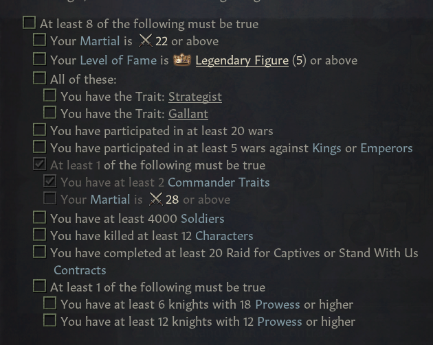 6. 정통주의자: 자신의 명분 작위 차지하는 것이 목표 - 왕급 이상 작위에 대한 압박 명분 1개 이상 보유 시 채택 가능, 다른 통치자들이 보상을 대가로 명분 지지해주는 특수 계약 획득 가능(금이나 병력을 제공해줌), 4&8년 시간 제한이 지나면 지지자들은 보상을 요구하기 시작해 결정을 내려야 함[침공 시작, 기간 지연, 페널티 받기], 물론 그 전에 지원받아 침공 시작해도 됨