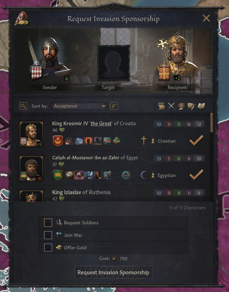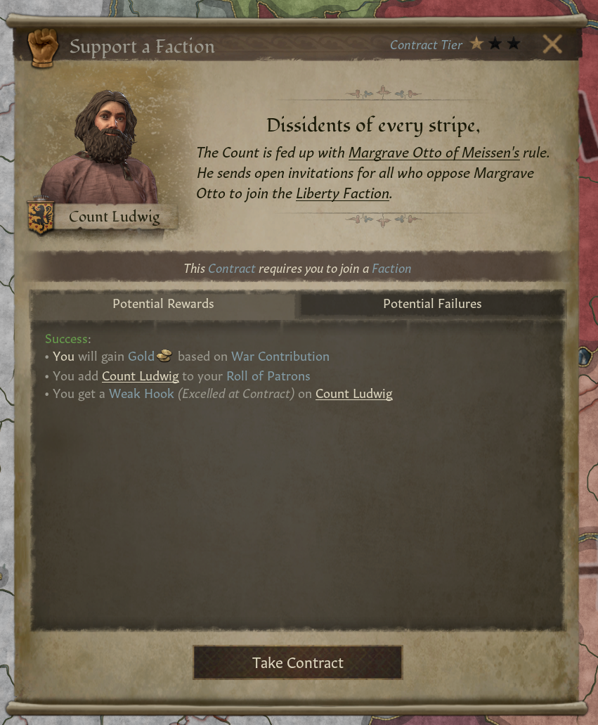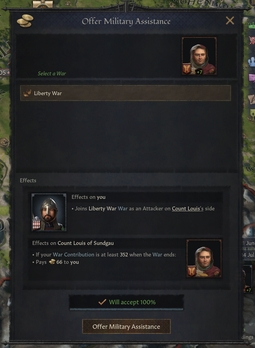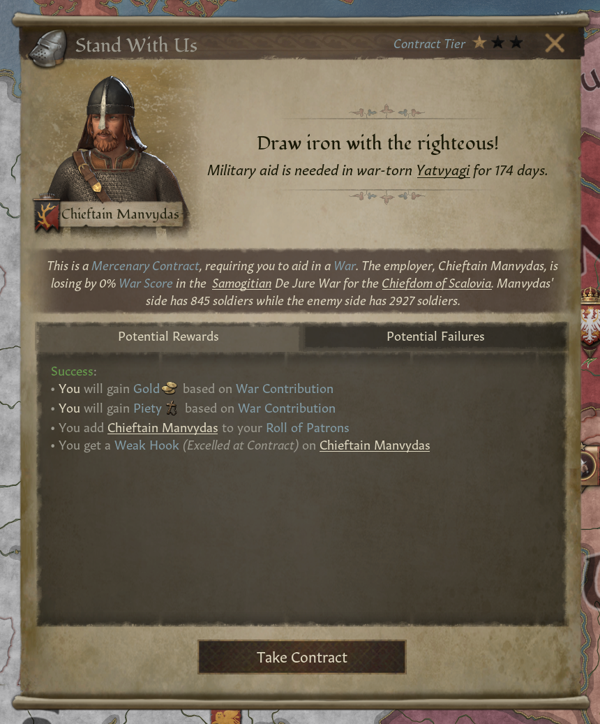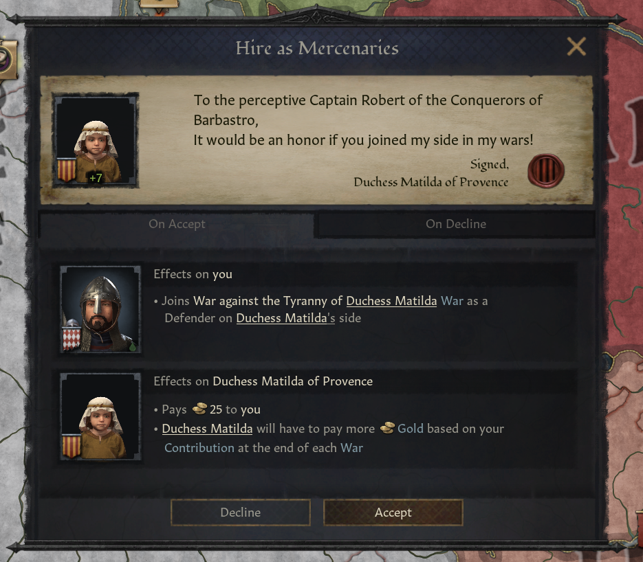 -이베리아 투쟁 DLC에 있던 군사 지원 제공 상호작용도 사용 가능: 계약 나오지 않은 현재 진행 중인 전쟁 참여 가능 - 계약보다 보상 적음