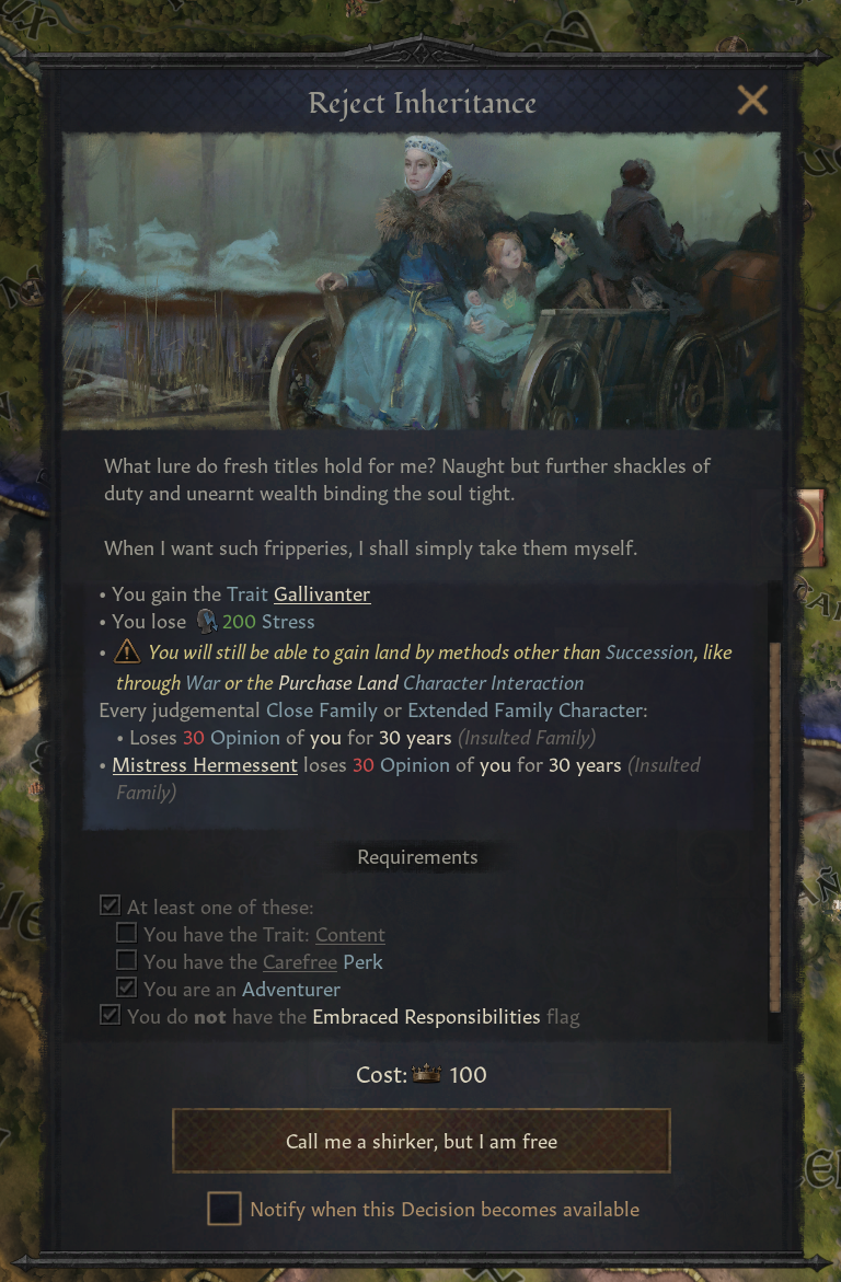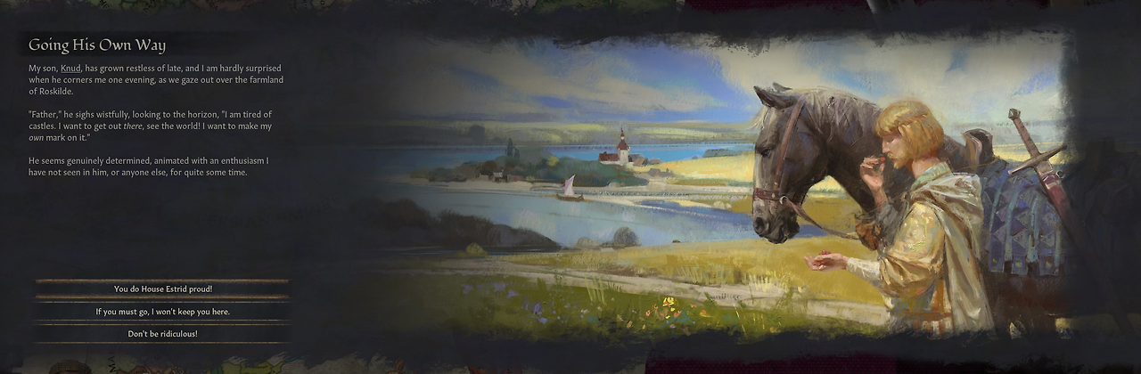 2. 가출 자녀: 계승 서열에서 후순위로 밀린 성인 자녀들 중 일부는 모험가로서 떠나게 해달라고 요청하기도 함, 당신이 거절하더라도 떠나는 경우도 존재 - 이때 해당 자녀로 모험가 플레이 선택 가능