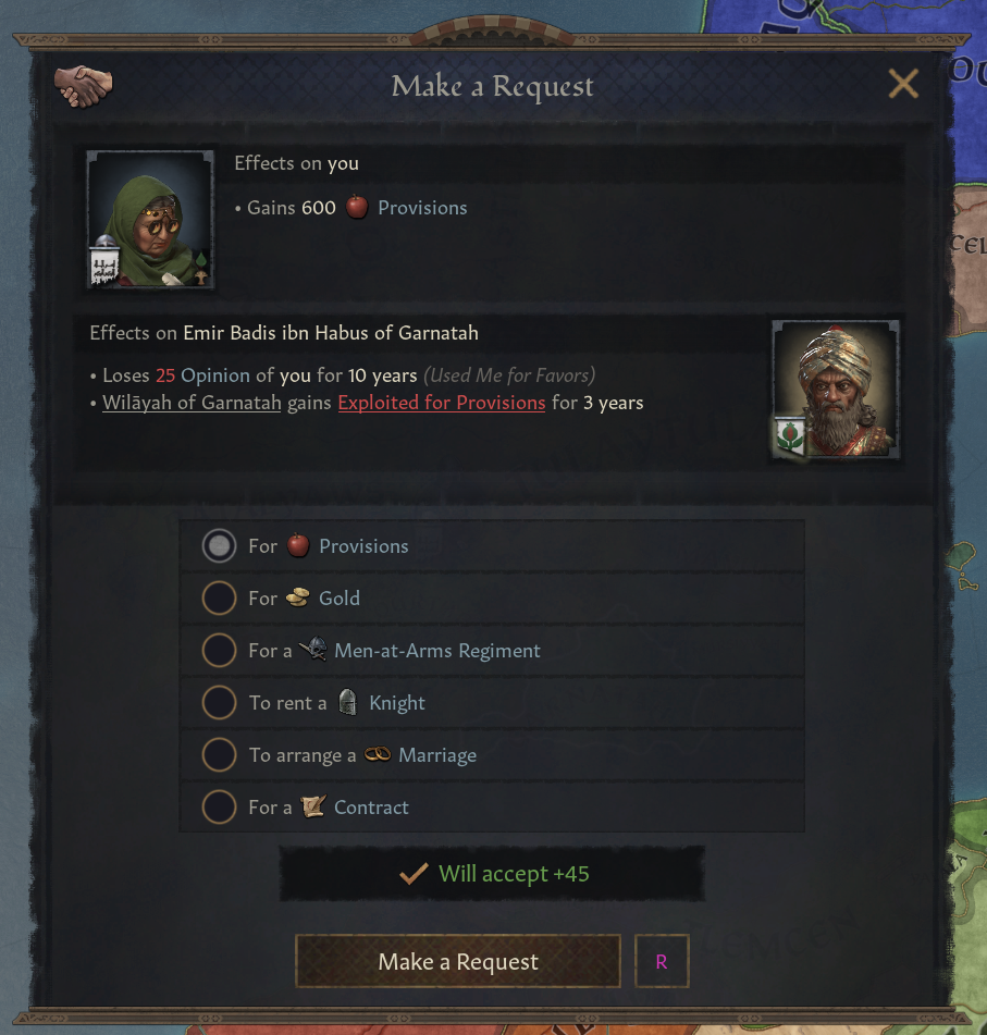 -통치자 봉역 내에 들어가면 후원자, 가까운 가족, 배우자일 경우 인물 상호작용으로 식료품,금, 기사,결혼,계약,무장병 요청 가능