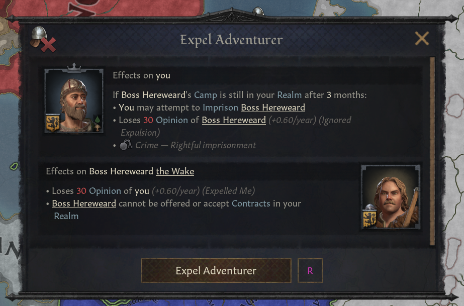 -인물 상호작용으로 자신의 봉역 내에서 모험가 추방 가능(봉신 영지 포함)