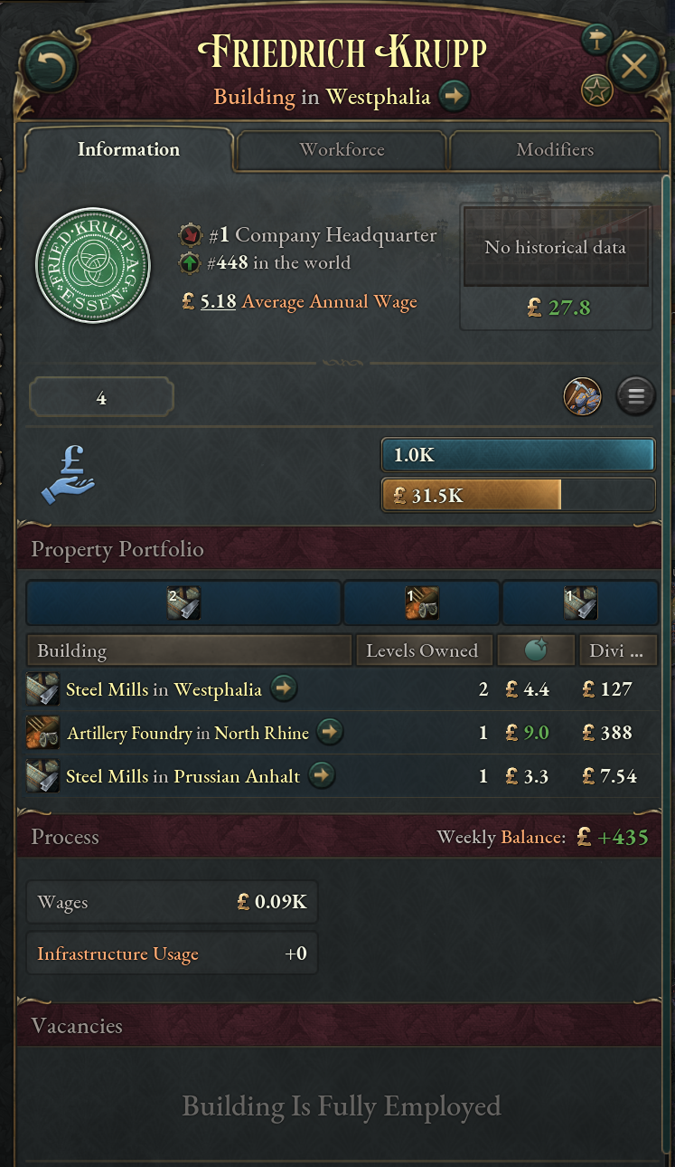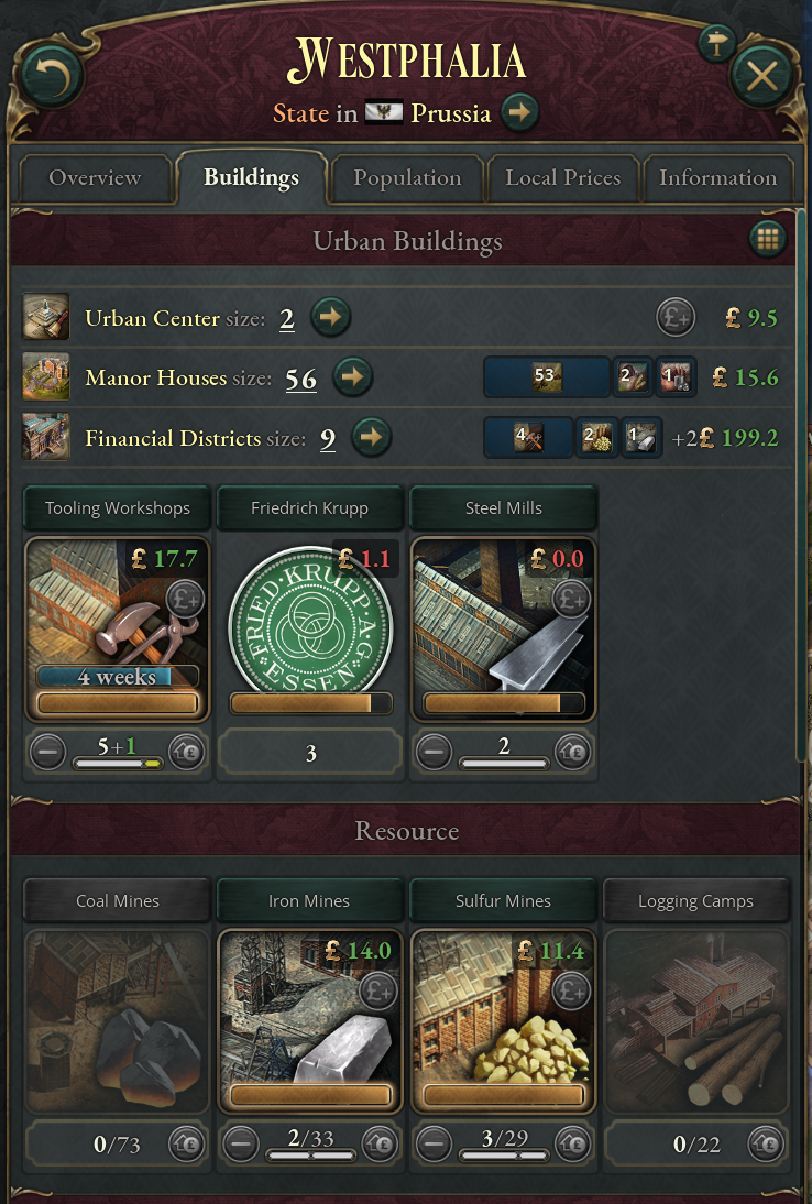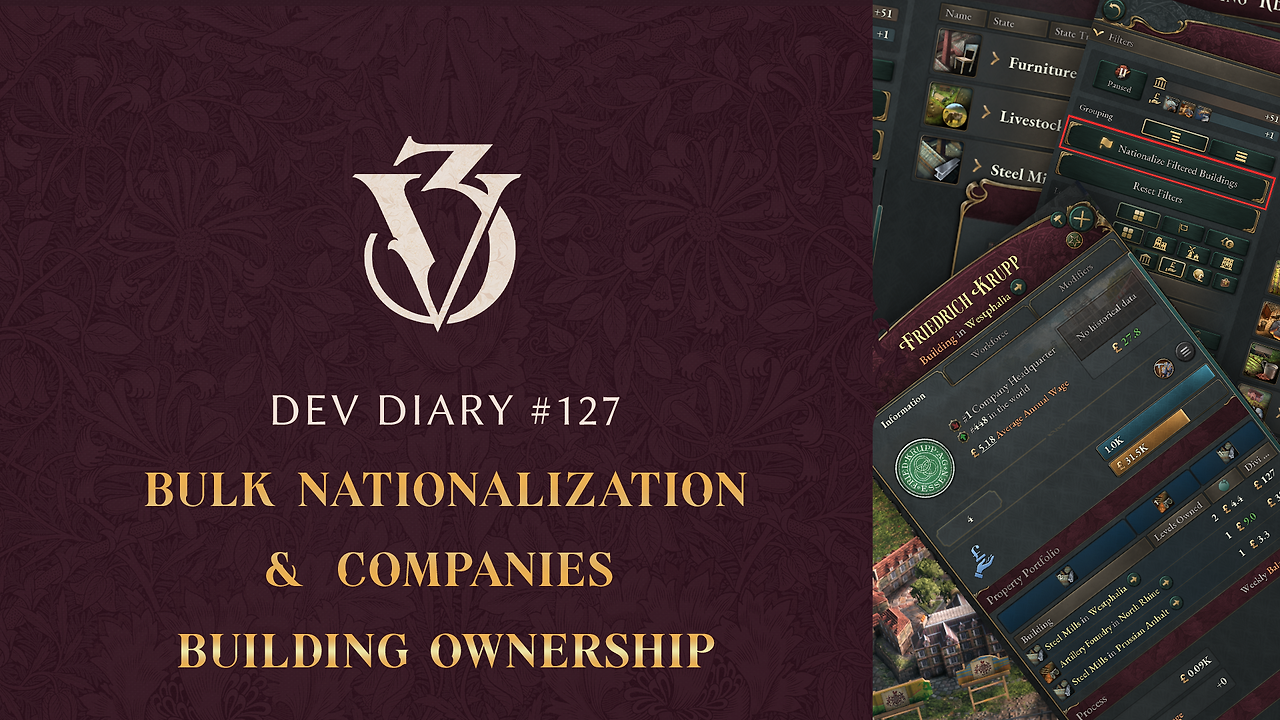 이를 구현하기 위해 각 설립된 회사마다 본사(HQ) 건물이 할당되었습니다. 이 건물은 금융가나 저택과 비슷해서, 팝을 고용하며 소유권 포트폴리오를 표시합니다. 플레이어가 국가를 전문화하기 위해 설립할 기업을 선택하는 것은 동일하지만, 구체적으로 작동하는 방식은 달라진다는 뜻입니다. 본사를 설립하기 위해서는 국영 건물을 몇 개 내어주거나, 필요한 자본을 공급해야 합니다. 구체적인 숫자는 만드는 중이지만 아마 경제법에 따라 조건이 달라질 것입니다. 기업을 설립하기로 결정했다면 해당 산업이 많이 있는 주가 어디인지에 따라 본사의 위치가 자동으로 결정됩니다. 예를 들어 프리드리히 크루프를 설립하면, 제강소, 무기 공장, 화포 공장이 가장 많은 주에 본사가 생깁니다.