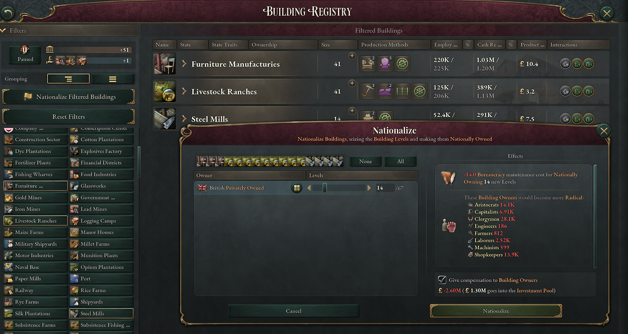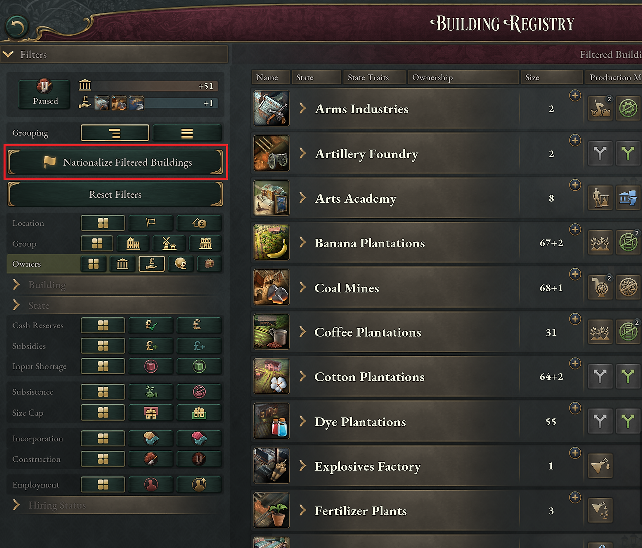 예를 들어, 외국이나 외국인이 소유한 건물만 필터링한 상태에서 모두 국유화를 누르면 그것들만 국유화됩니다. 다른 예시로 서 벵갈에 있으며 품귀를 겪고 있고 고용하지 않는 건물만 국유화할 수도 있습니다.