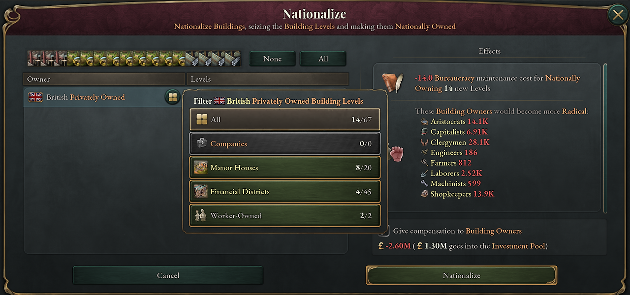 이렇게 영향받는 건물의 목록이 뜨며, 슬라이더로 몇 개 국유화할 지 고를 수 있습니다. 만약 소유주가 여럿 있다면, 각각을 위한 슬라이더가 따로 있습니다. 왼쪽에는 누가 소유하고 있는지에 따라 필터링할 수 있는 버튼이 있습니다(어차피 지주는 필요없으니까)