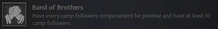 -전우애: 10명 이상의 야영지 부하 보유 및 모든 부하들이 긍정적 기질 보유