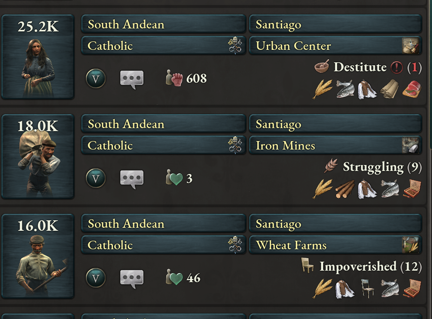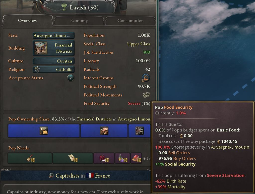 두 번째 항목에 부연설명을 하자면, 생활수준에 따라 팝들은 몇 가지 수요를 정해진 만큼 소비합니다. 이때 총 금액은 기본 가격으로 계산하지만, 식량 지출 금액은 실제 시장에서 사오는 가격으로 계산됩니다. 예를 들어 생활수준 9에서는 기본 의복, 기본 식량, 조잡한 도구, 난방, 중독제 수요를 가집니다. 이를 모두 구매하기 위한 기본 가격은 314원입니다. 그러나 팝이 속한 시장에서 곡물이 비싸 구매하는데 220원이 든다면 220/314=70%가 식량 수요에 사용됩니다.