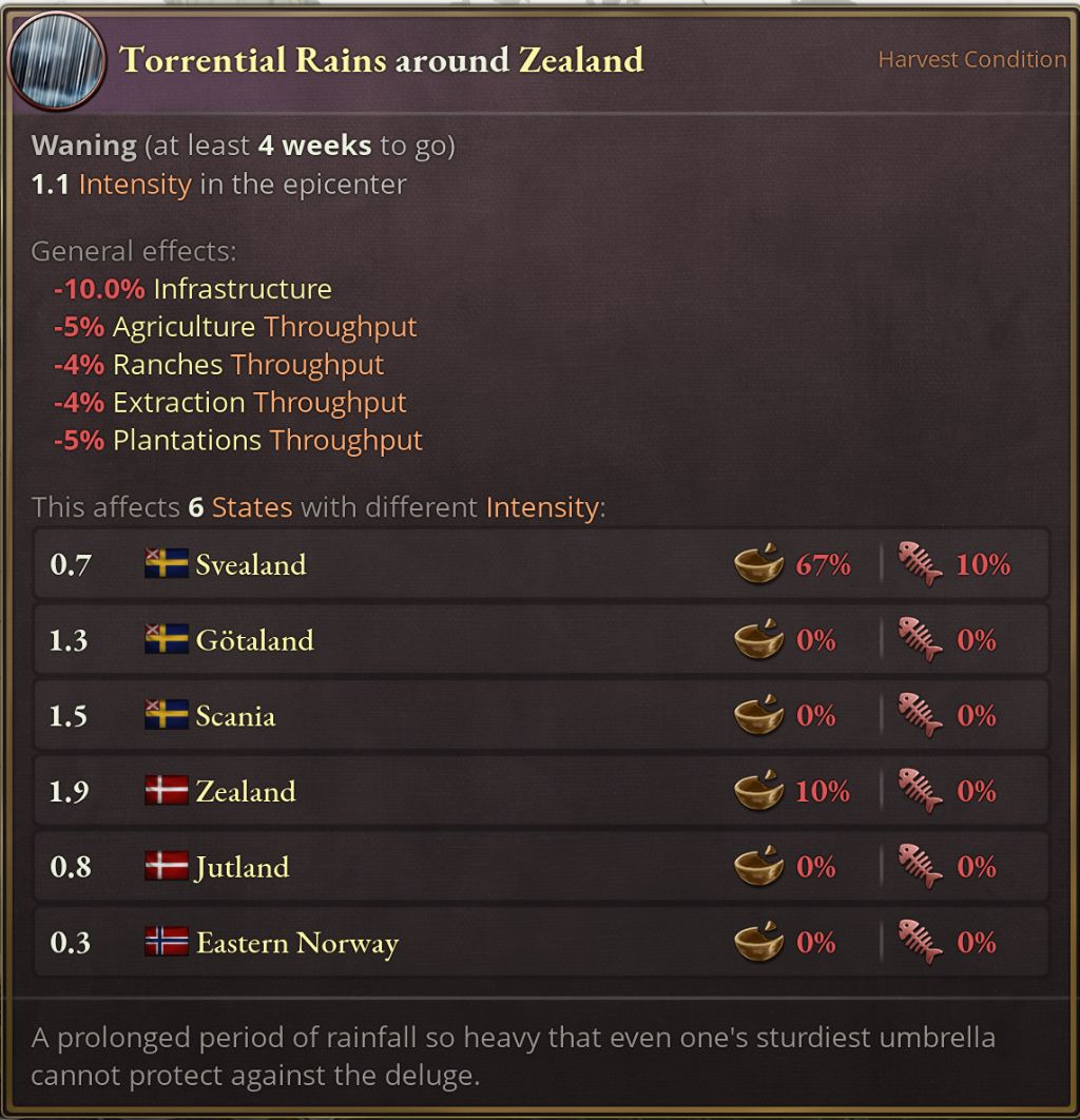 식량 수급에 예측 불가능함과 시간에 따른 요동을 주기 위해 작황이라는 것을 추가했습니다. 작황은 (꼭 그런건 아니지만 주로 날씨와 연관된) 사건으로 각 주의 농업 생산력에 영향을 줍니다