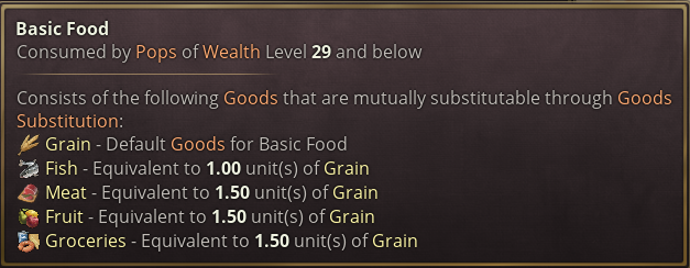 게임을 조금 해보신 분들은 아시겠지만 팝들은 생활 수준에 따라 특정한 수요를 가집니다. 수요는 기본적인 식량과 옷에서 사치품까지 다양합니다. 기본 식량의 경우 곡물, 과일, 고기, 생선, 식료품으로 충족될 수 있습니다.