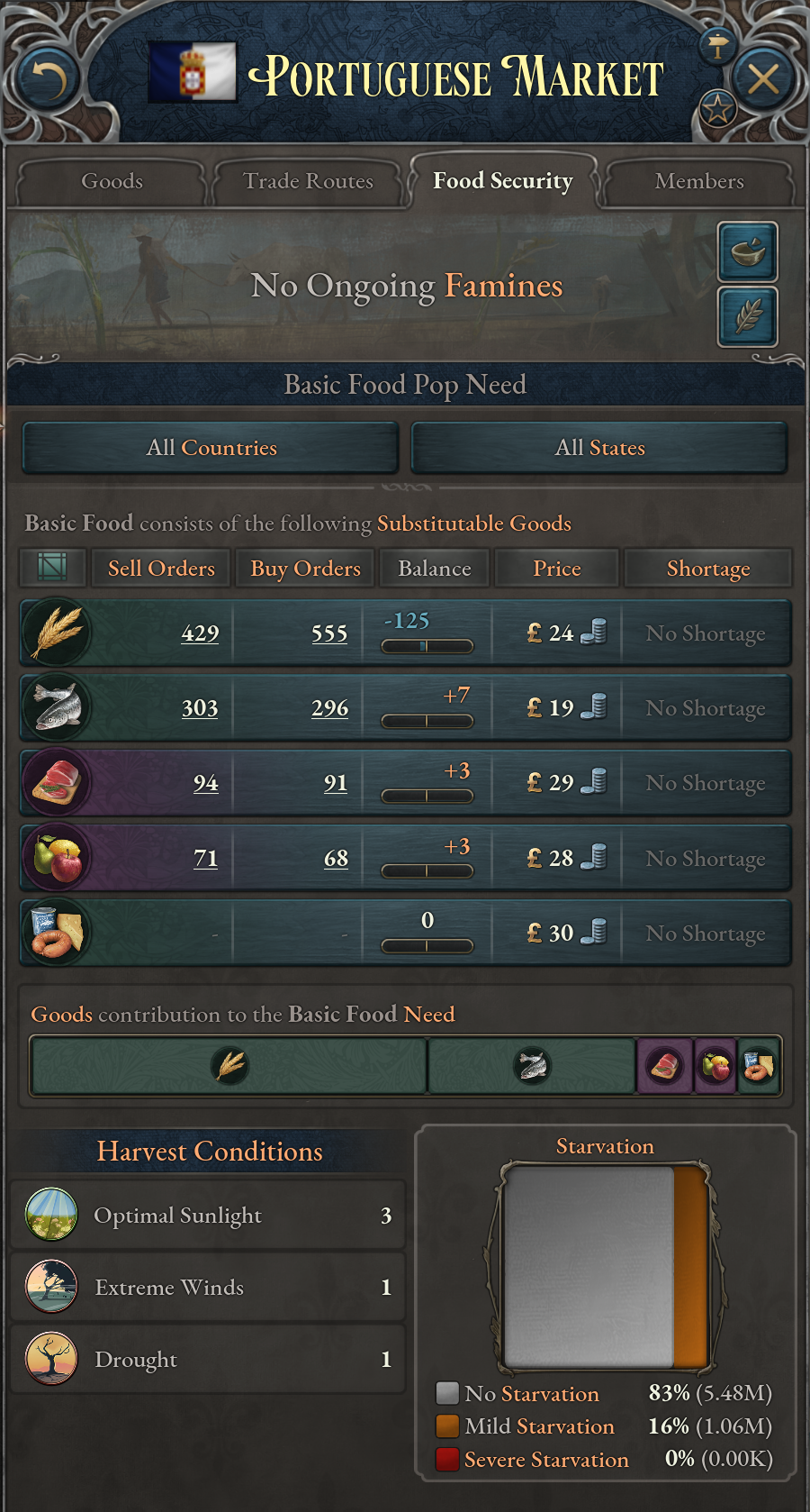 새로운 것은 기본 식량 수요 자체에도 품귀가 추가된다는 것입니다. 이는 각 식량 상품의 품귀 정도에 그 상품이 팝에 의해 소비되는 비중만큼 가중치를 넣어 계산됩니다. 예를 들어 팝들이 곡물을 9할, 생선을 1할 소비하는 시장에서는 곡물의 품귀가 더 큰 영향을 줄 것입니다.