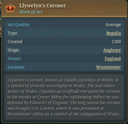 - 공성전이나 일반적인 점령을 통해 위치를 정복할 경우 예술 작품은 약탈당하거나 파괴당할 수 있음