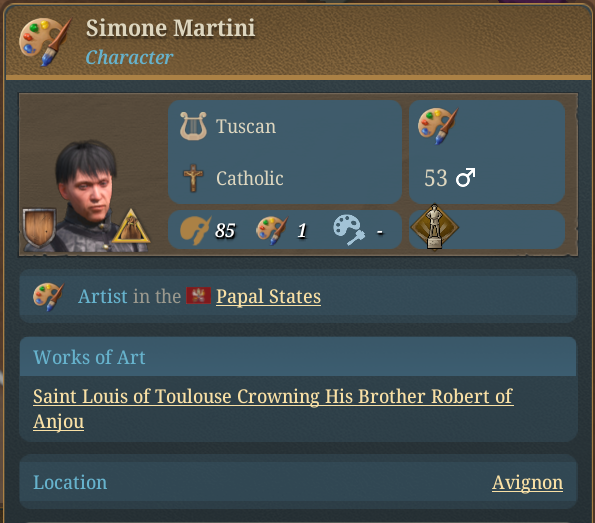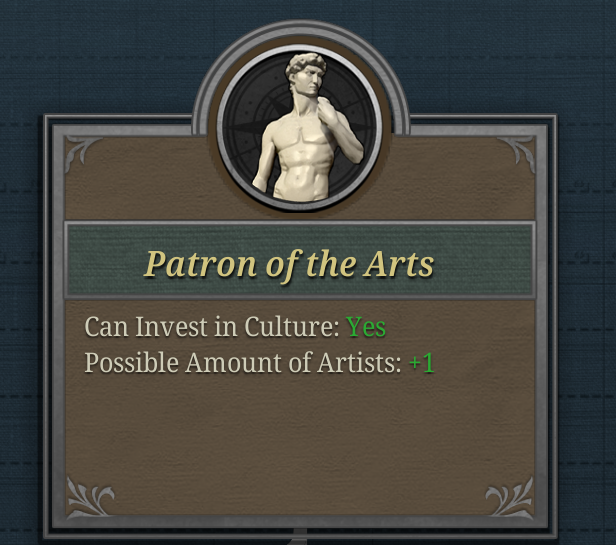 - 해당 예술가는 플레이어 국가로 이주하여 그가 창작한 예술품을 플레이어가 유용하게 사용하겠지만, 그가 원래 있던 나라의 플레이어 국가에 대한 문화적 영향력이 커질 것임