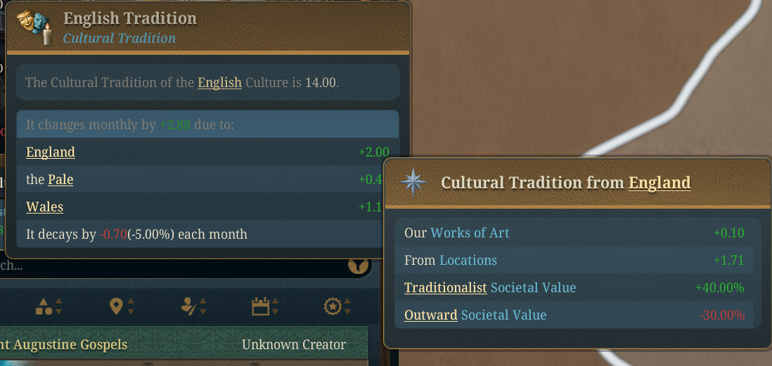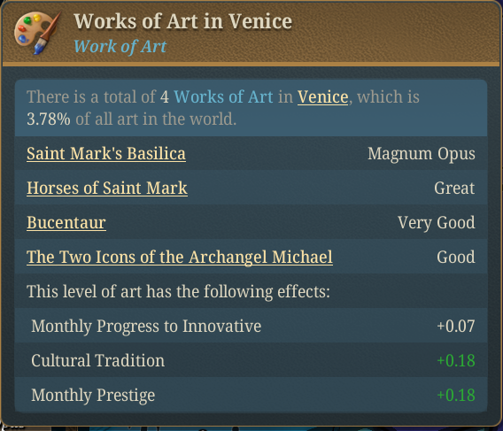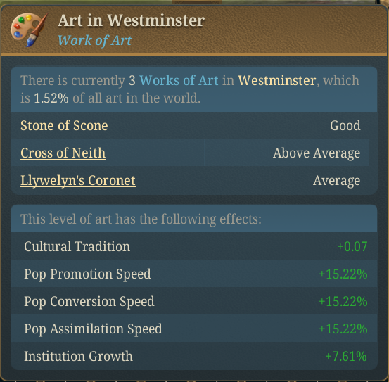 - 위의 스크린샷에서도 보이듯 국가의 주 문화는 예술과 귀족의 혜택을 받음