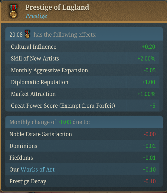 - 매달 투자하는 금액은 위신에 직접적인 영향을 미치며, 예술자들의 능력과 그들이 창작하는 예술에도 영향을 줌