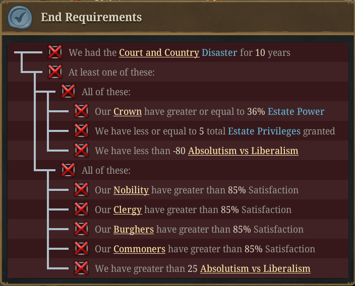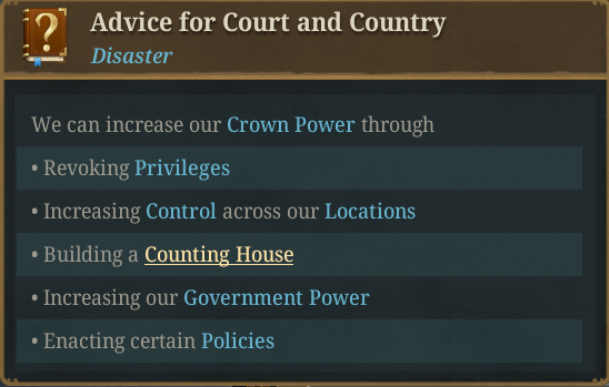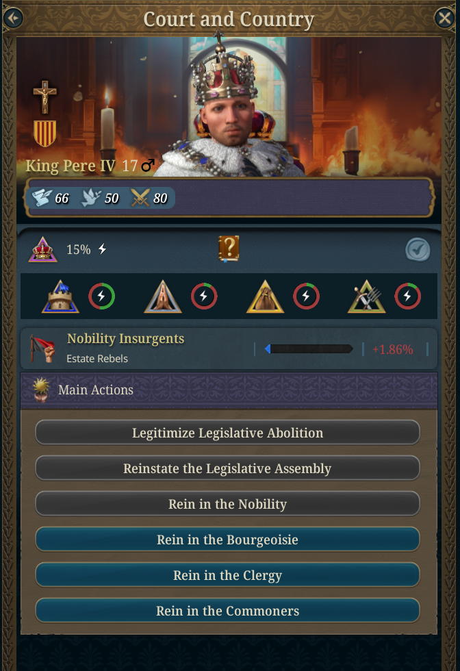 - 위의 화면에서 보이듯이 이 재앙의 UI에는 현재의 왕권과 계층의 권력이 표시되며, 내전 발발에 가장 근접해 있는 반란군의 상황도 표시됨. 또한 재앙 중에 수행할 수 있는 행동도 표시됨. 화면에서 보이듯 귀족은 이미 너무 강력하기 때문에 통제가 불가능함