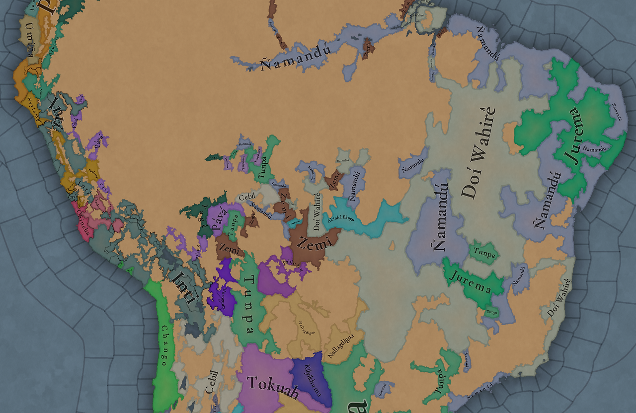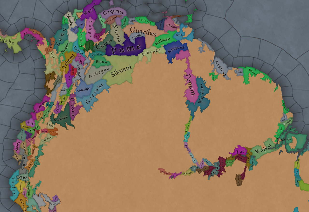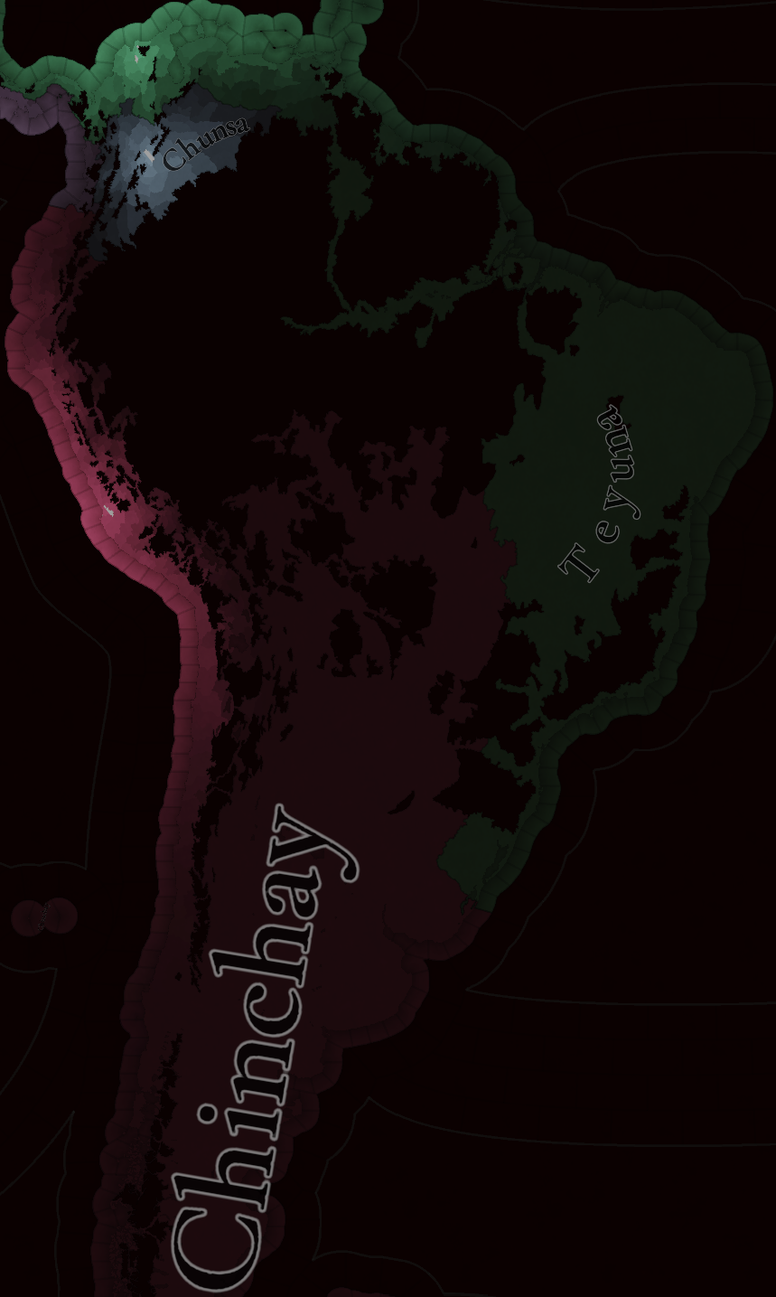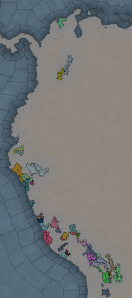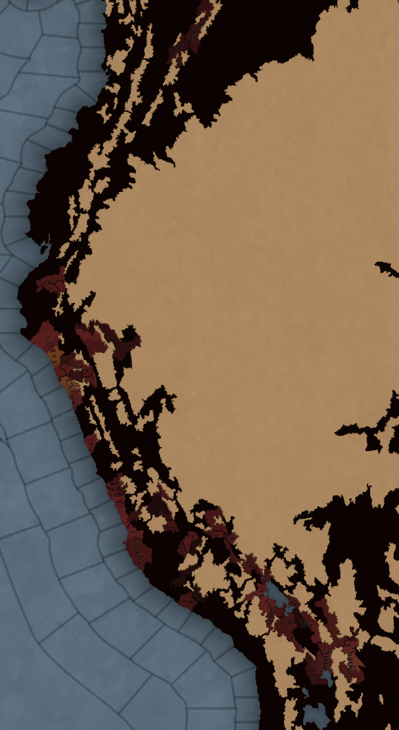 대륙 전체에 팝들의 사회가 퍼져있으며, 특히 페루에 (또다시) [팝들의 사회와 일반 국가가] 흥미롭게 섞여 있습니다. 우리는 두 가지 국가의 공존을 지도에 보기 좋게 표시하는 방법을 생각해 보고 있지만, 시간이 조금 필요합니다